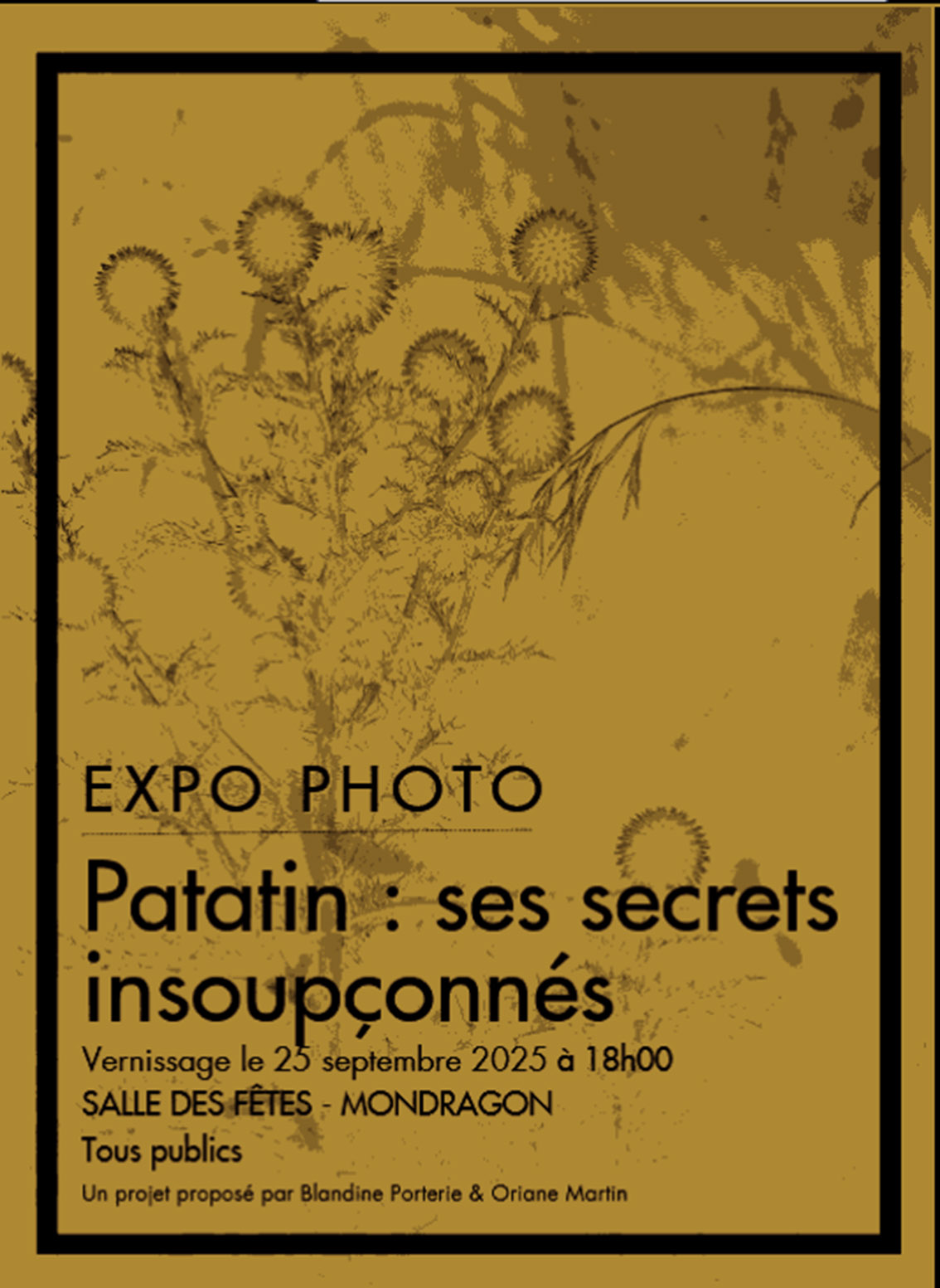 Le Maire Christian Peyron et son Conseil Municipal ont le plaisir de vous convier au vernissage de l’exposition photo « Patatin : ses secrets insoupçonnés », qui se tiendra le jeudi 25 septembre à 18h00 à la salle des fêtes de Mondragon.