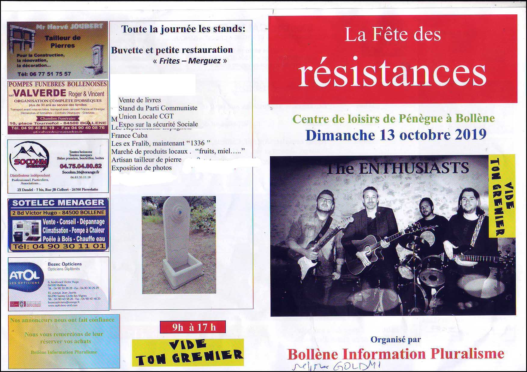 Assurée par Annie André, militante aguerrie, une conférence de presse au siège local du PCF vient d’annoncer l’événement, prévu dans le cadre bucolique du centre de loisirs de Pénègue. C’est là que l’association Bollène Information Pluralisme (BIP) vous invite à participer à la « Fête des Résistances », le dimanche 13 octobre de 9h à 18h.
