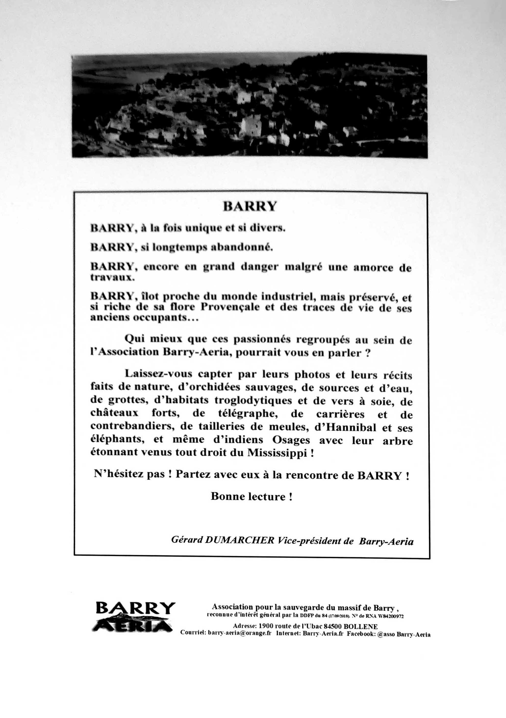 Autres actions : contacts avec des propriétaires de parcelles à Barry, amélioration du site Internet, finalisation du dosser d’intérêt général et suivi du dossier transmis à Stéphane Berg qui, cerise sur le gâteau, parmi 250 candidats voulant sauver un site en péril, aboutit à une subvention de 198 000 € pour Barry, allouée à la municipalité de Bollène.