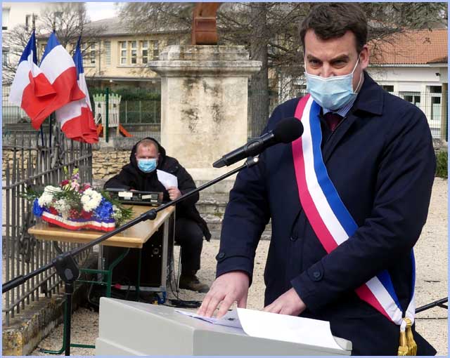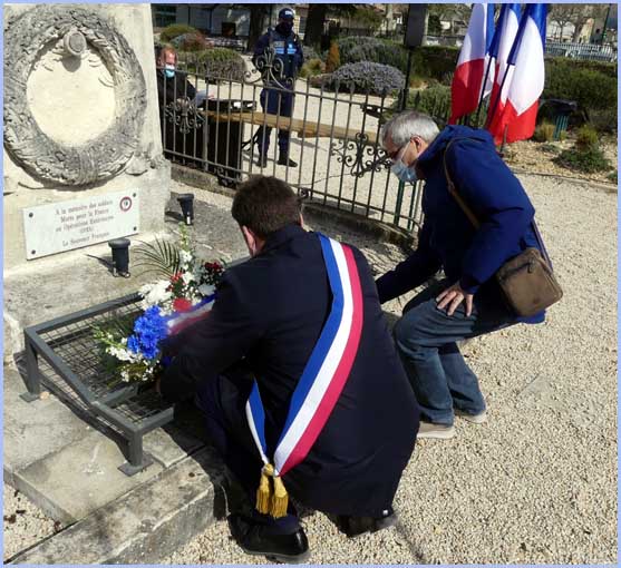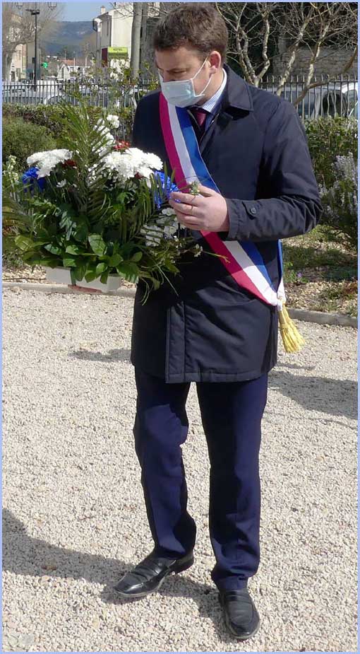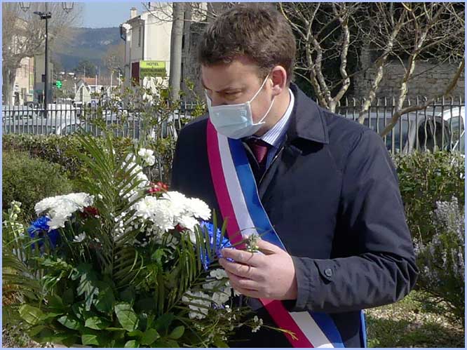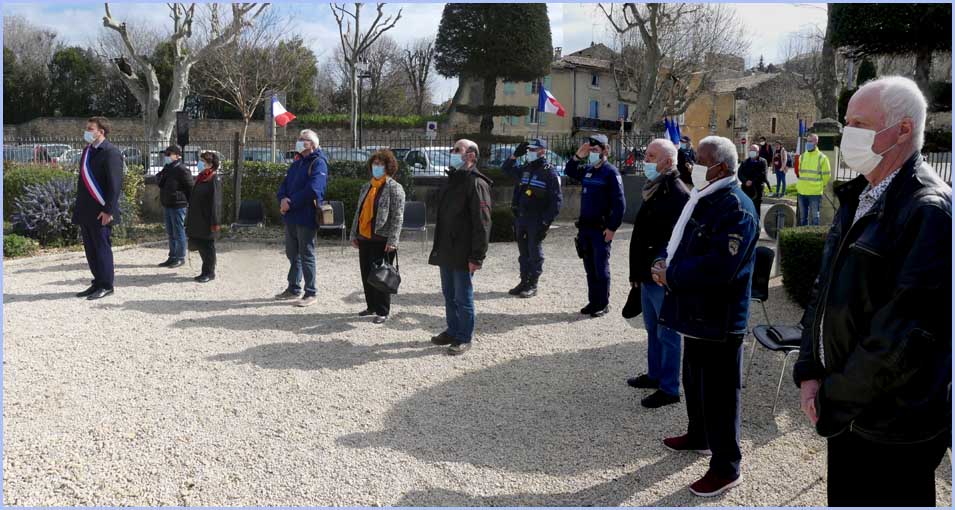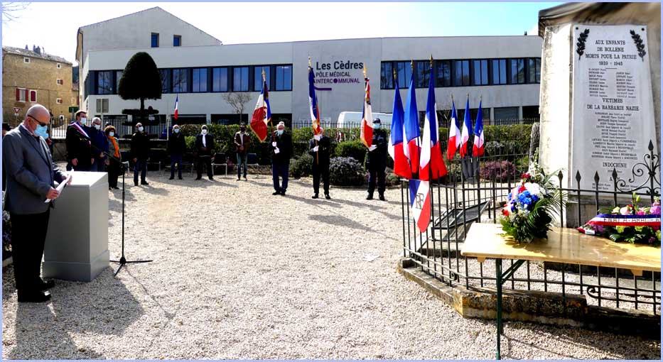 Une assistance réduite et masquée occupait le jardin du Souvenir. Ces contraintes anti-pandémiques n’ont pas empêché un vibrant hommage à la mémoire des victimes de la guerre d’Algérie. Avant un dépôt de gerbes au Monuments aux Morts, dans son discours, le maire Anthony Zilio a rappelé, d’après le Journal Officiel, les 23 196 morts dont 11 913 appelés du contingent et, plus précisément, 4 soldats bollénois, Emile Navarro, Pierre Delarque, Marcel Sargian et Edmond Saladin.     J. P.