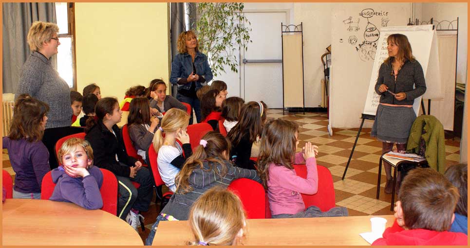 Rencontre entre une classe de l’école Sainte-Marie et l’auteur Nadia Gypteau (au centre).