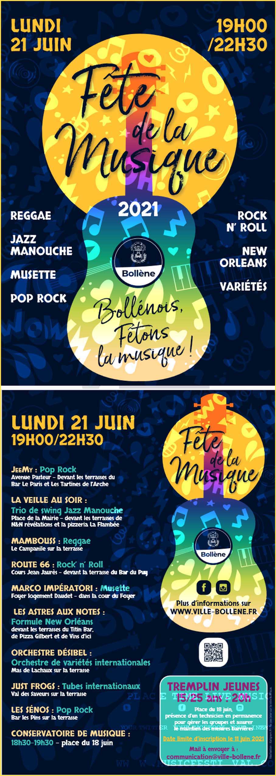 Ville de Bollène - Lundi 21 Juin 2021 Musiques tous azimuts ![]() ![]() |