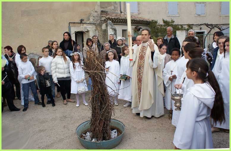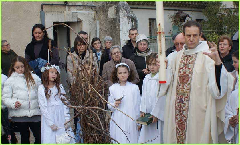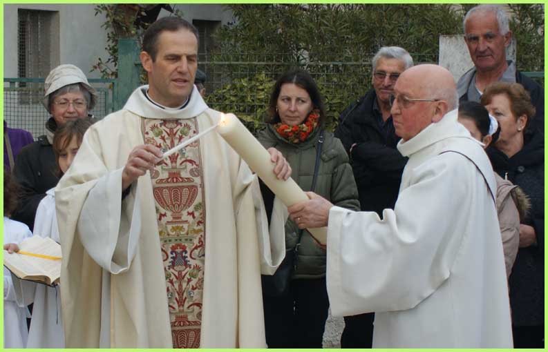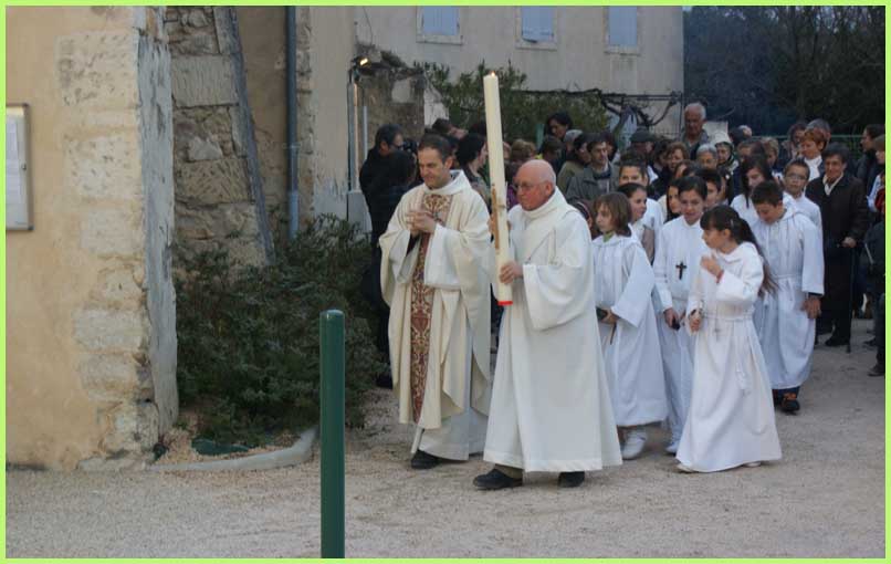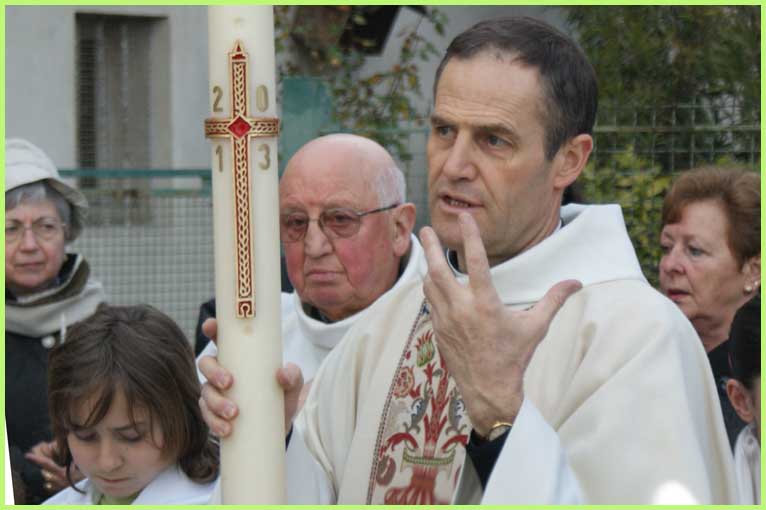 Imperturbable et secondé par son diacre Guy Humbel, M. le curé a cependant déployé certain faste : un rassemblement à l’extérieur autour d’un fagot de bois enflammé, puis d’un grand cierge à l’effigie du Christ. La flamme était aussitôt démultipliée par autant de mini-cierges individuels distribués par les enfants. Une courte procession aboutira ensuite à l’entrée de l’église où sera proclamée la résurrection du Christ. Le baptême de quatre enfants et d’un adulte marqueront encore cet épisode biblique.