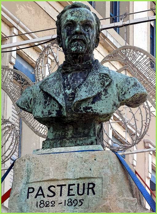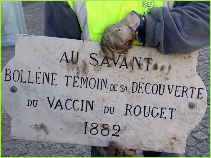 Petit historique. En 1882, à Bollène, le médecin-vétérinaire Achille Maucuer (1823-1934) accueille chez lui Louis Pasteur (1822-1895). Leur collaboration aboutit au fameux vaccin contre le rouget du porc. D’où la reconnaissance de la Ville qui, entre autres, baptisera une avenue et son hôpital du nom de Pasteur. Dont un buste en bronze est inauguré en 1924, suivi d’une refonte en 1943, pour une restitution en pierre en 1945 qui occupera l’avenue Pasteur.