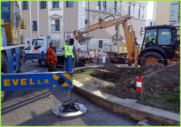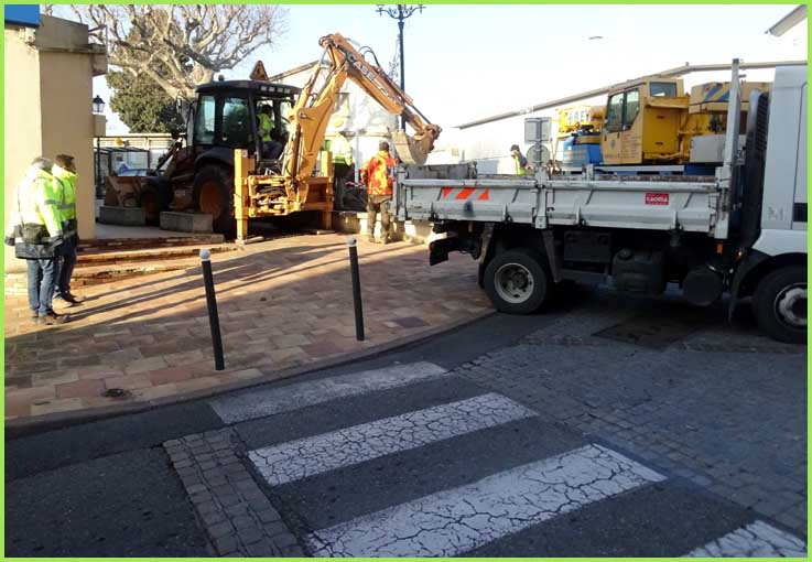 Ce vendredi matin, en centre ville, la circulation est passablement perturbée. Des travaux se situent aux extrémités des avenues Gambetta et Pasteur, à la hauteur du carrefour de la rue des Chabrières, momentanément impraticable. Autour d’un grand trou béant, en bordure de la chaussée, le chantier occupe une équipe d’ouvriers et de gros engins, de la Société Vauclusienne de Traitement (Mondragon), mandatée par la Ville de Bollène.