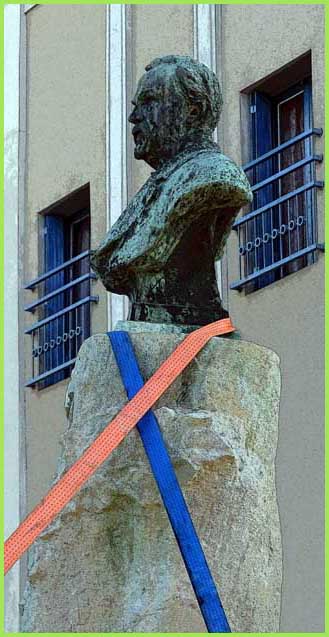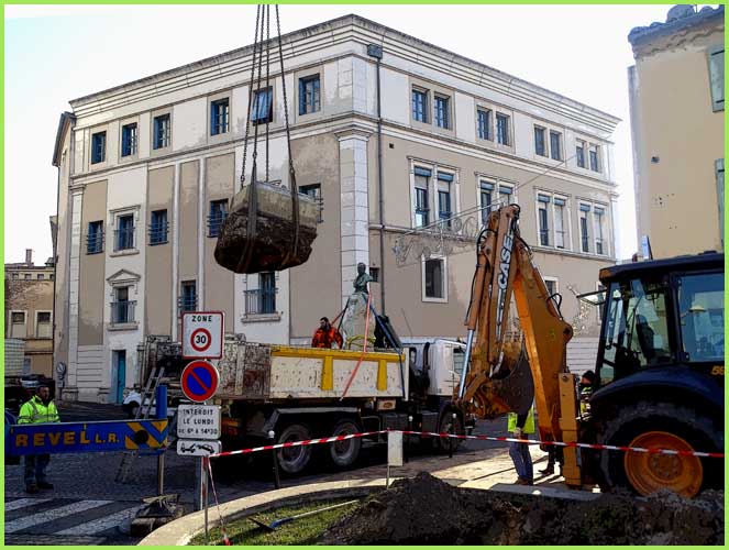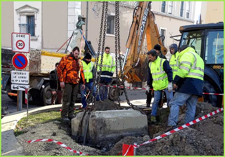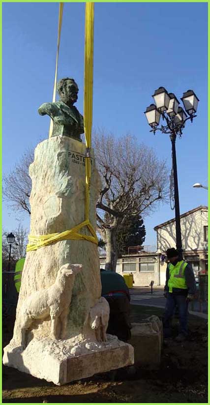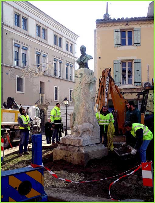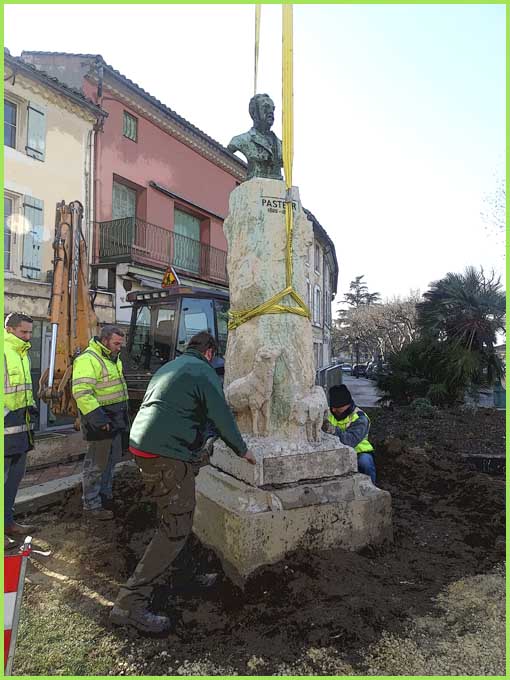 Les statues voyagent à Bollène. Pourquoi ce chambardement ? La réponse fuse : « Pour rendre sa place légitime à Louis Pasteur ! » Le trou béant est en effet destiné à la mise en place d’un buste du grand scientifique. A lui seul, le socle pèse 5 tonnes, et la partie supérieure, 3 tonnes. Soit deux blocs pesant au total 8 tonnes, trimbalés pour la troisième fois dans la ville : mise en place initiale, puis deux déménagements.