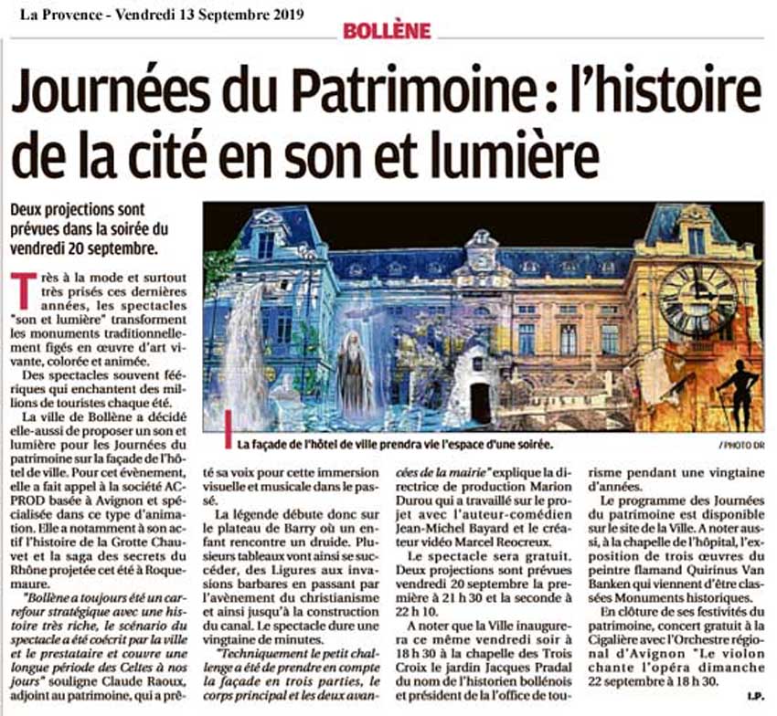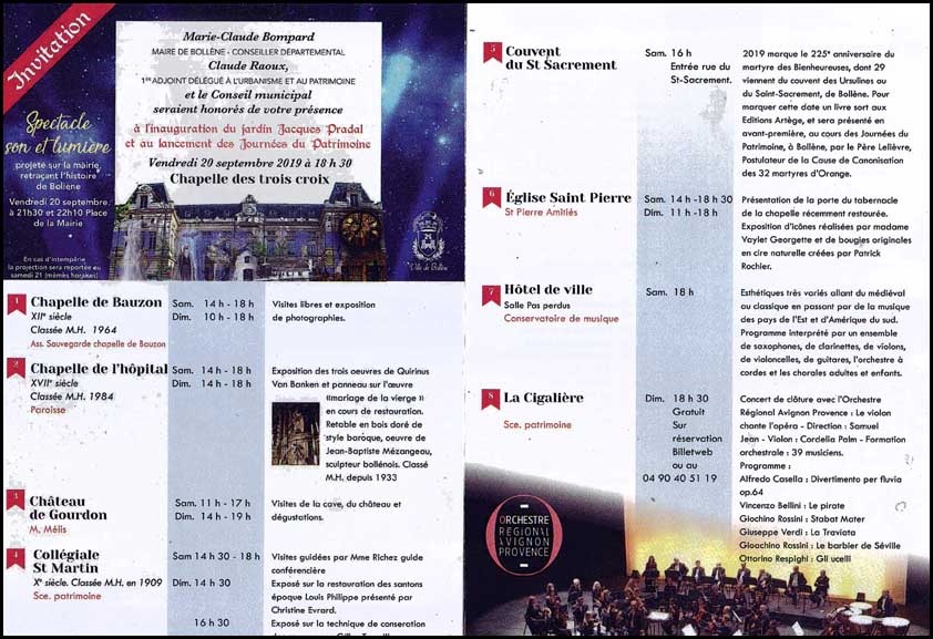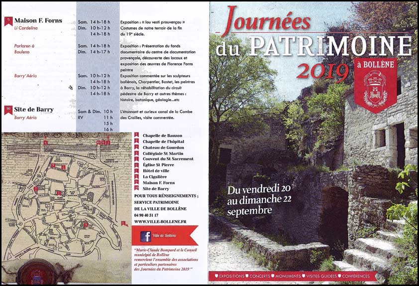 Ce vendredi à 18h30 devant la chapelle des Trois Croix, seront inaugurés le jardin Jacques Pradal, historien local, puis lancées les journées du patrimoine. Le même soir à 21h30 et 22h30, sur la façade de l’hôtel de ville, un spectacle son et lumière sera projeté en retraçant l’histoire de Bollène (voir article presse).
