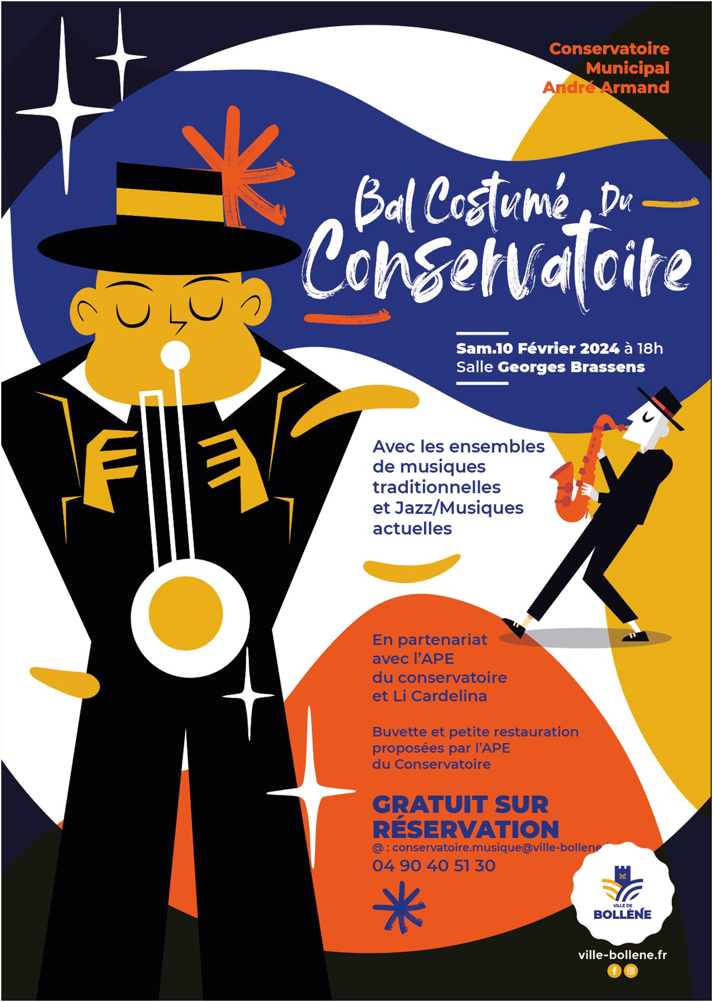 En partenariat avec l'association des parents d'élèves (APE) et le groupe folklorique Li Cardelina, le conservatoire vous propose un bal costumé, animé en première partie par les ensembles de musiques traditionnelles, dirigés par Valentin Conte, et, en seconde partie, par l'atelier jazz/musiques actuelles, dirigé par Gilles Vernet. Buvette et restauration rapide sur place. Rendez-vous samedi 10 février 2024 à 18h salle Georges Brassens. Réservations gratuites : 04.90.40.51.30 ou conservatoire.musique@ville-bollene.fr.
