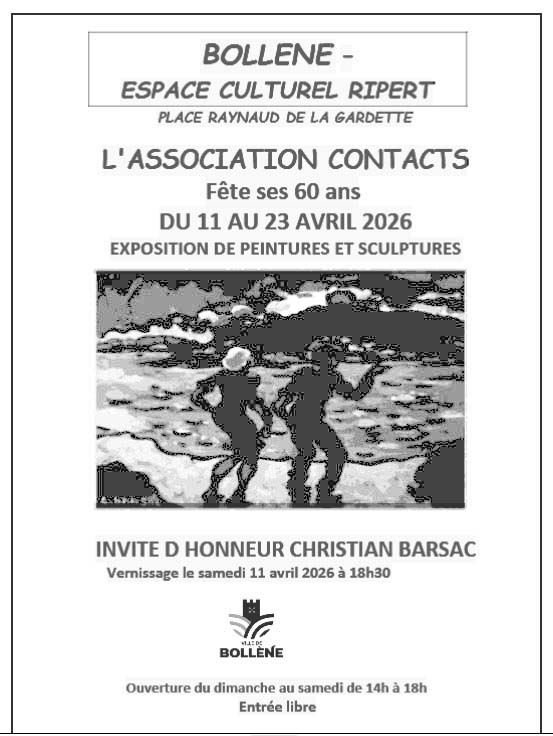 Apparu en 1965, ce bel exemple de longévité associative est bien celui du groupe Contacts qui regroupe toujours à ce jour un bonne vingtaine de peintres amateurs du canton. Durant six décennies, nous avons suivi la trajectoire infaillible de cet art du terroir, au gré d'expositions ponctuelles à Bollène et sa région. Noëlle Pizano-Chalan, actuelle présidente, et son bureau, invitent le fidèle et nombreux public au prochain anniversaire, qui coïncidera avec une présentation d'oeuvres plurielles, dont celles de Christian Barsac, invité d'honneur. Vernissage prévu samedi 11 avril à 18h30 à l'espace culturel Ripert. L exposition sera ouverte du 11 au 23 avril 2026 de 14h à 18h. Entrée libre.