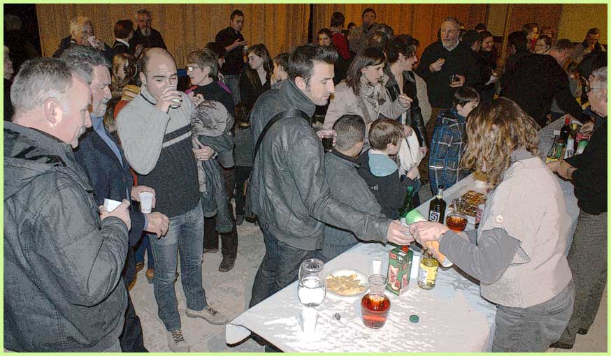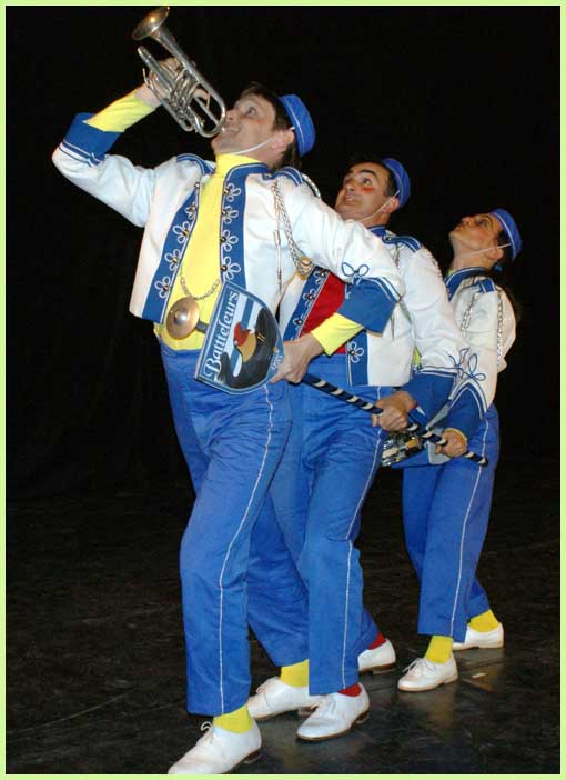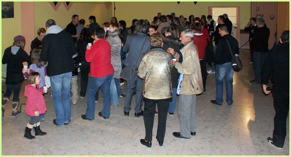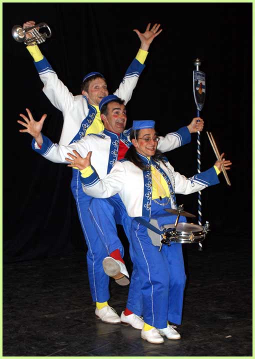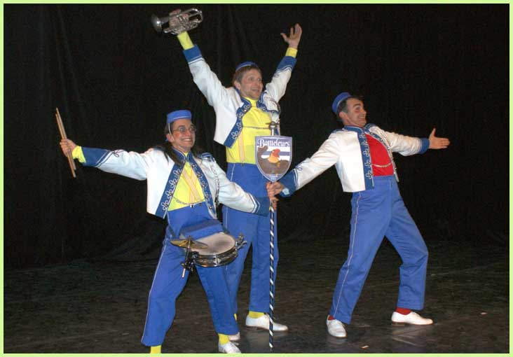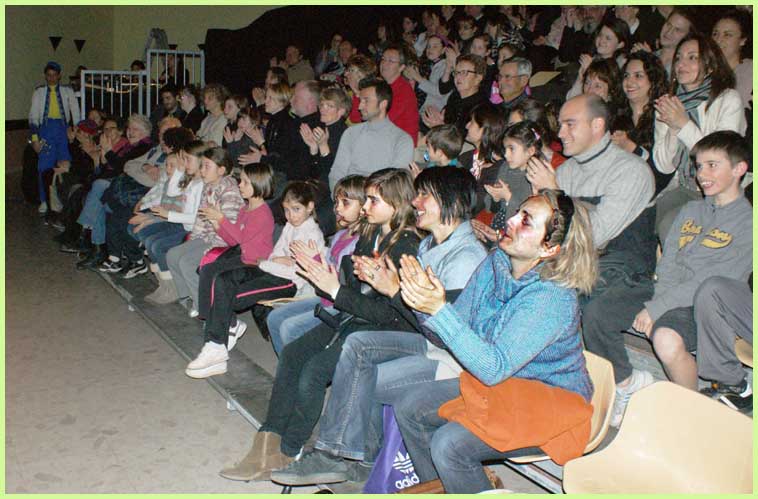 des gradins de la salle des fêtes, où ont surgi trois bateleurs,