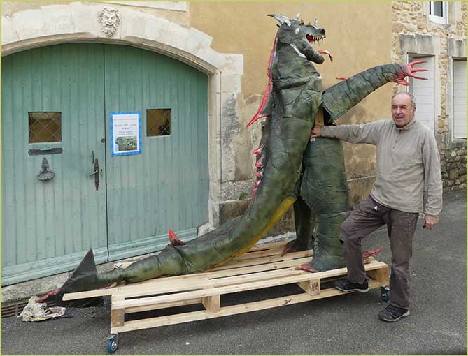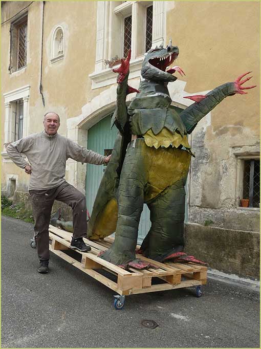 Surgi d'une légende du Rhône, le monstre amphibie navigue surtout hors des eaux du fleuve. Doué d'ubiquité, il a plusieurs têtes et autant de tailles différentes. Qui sont surtout l'œuvre de Roland Riché, peintre et sculpteur prolifique (photo), à qui l'on doit aussi la fabrication de nombreux décors et accessoires. Il travaille en solo, parallèlement au chantier du Comité des fêtes, dont il rehausse les efforts par son imagination créatrice. Entre ses mains, du toc devient magie. Il s'emploie ici à rafistoler le petit Dragon vert, maintes fois vu et revu aux fêtes médiévales du Drac et animations diverses. Le voici prêt à rallier le défilé historique du cinquantenaire imminent (du 10 au 15 mai prochains). J. P. |
