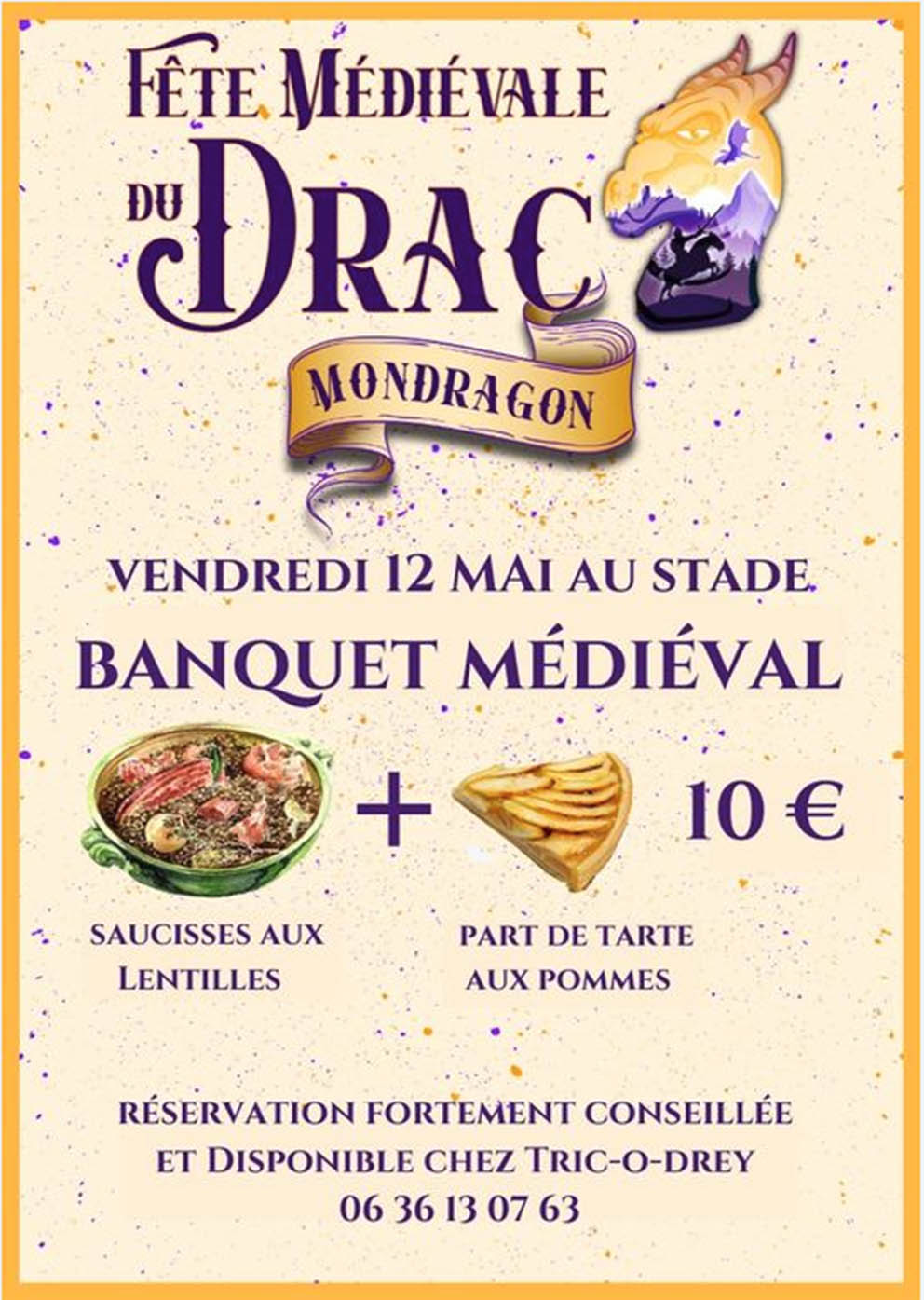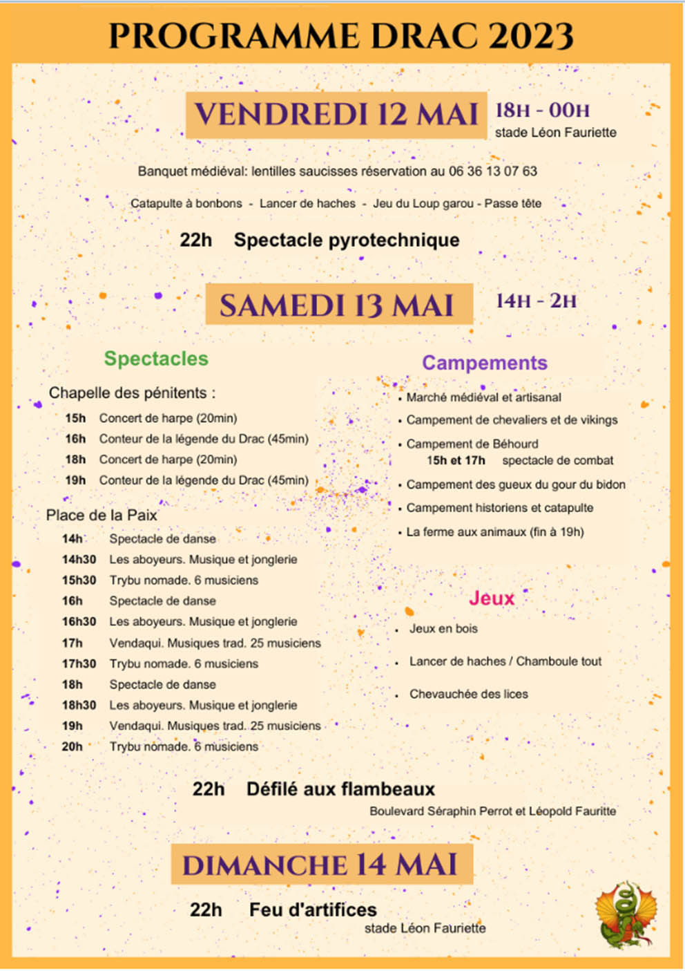 - Vendredi 12 mai à partir de 18h au stade Fauritte : banquet médiéval saucisses lentilles (réservations 06.36.13.07.63) et divers jeux, à 22 : spectacle pyrotechnique.