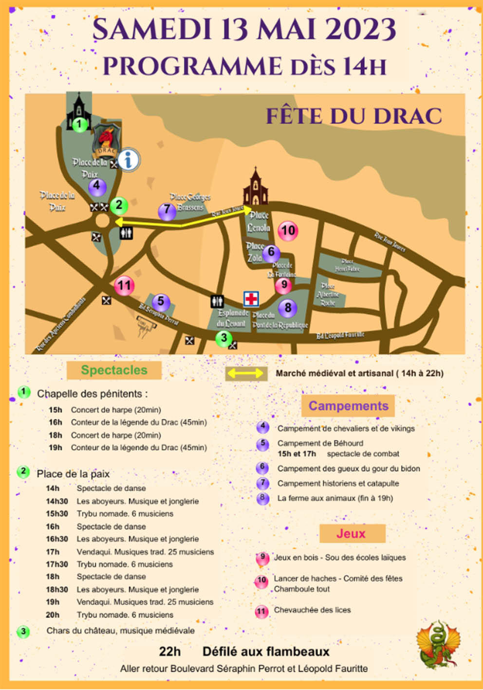 - Samedi 13 mai à partir de 14h : spectacles et concerts successifs à la chapelle des Pénitents et sur la place de la Paix. Marché médiéval, campements de chevaliers et vikings, combats, ferme aux animaux, jeux de bois d'antan. A 22h : défilé historique aux flambeaux.