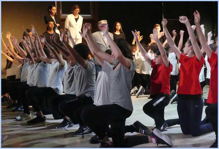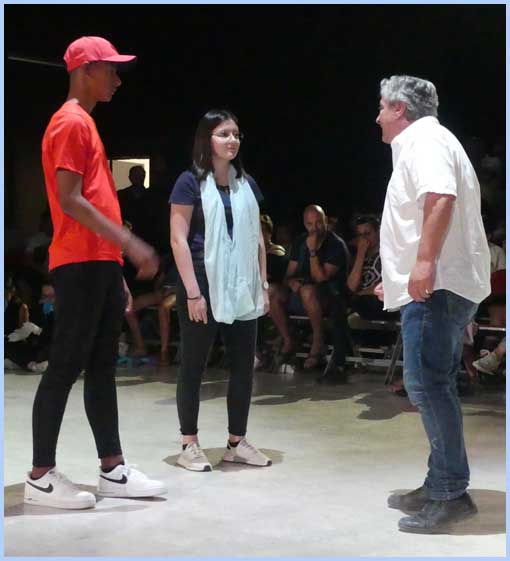 Le spectacle résulte d’une douzaine d’interventions pour chaque groupe d’élèves, initiés à la pratique théâtrale, tendant vers une fresque futuriste. Dans les faits, deux représentations de presque 2 heures ont successivement fait le plein. Pas de scène ostentatoire ni de rideau, mais un dispositif de plain-pied pour comédiens et public, avec deux podiums perpendiculaires. Soit une sorte de tribunal jaugeant les protagonistes : enfants, éducateurs, familles, etc. Le tout aspirant à un monde meilleur, préfiguré par une idylle entre Piter et Léna.               J. P.
