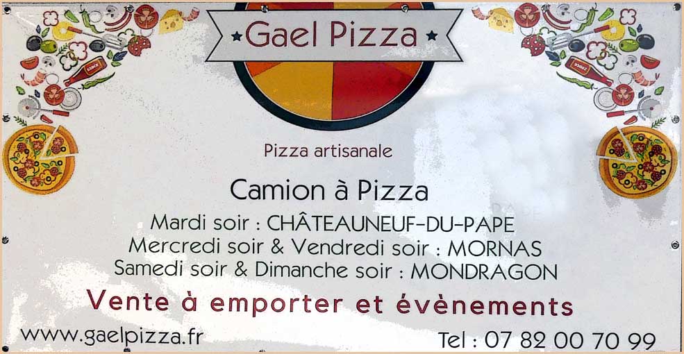 Gael Pizza et ses pizzas artisanales sont accessibles à Châteauneuf-du-Pape (mardi soir), Mornas (mercredi et vendredi soir) et Mondragon (samedi et dimanche soir).