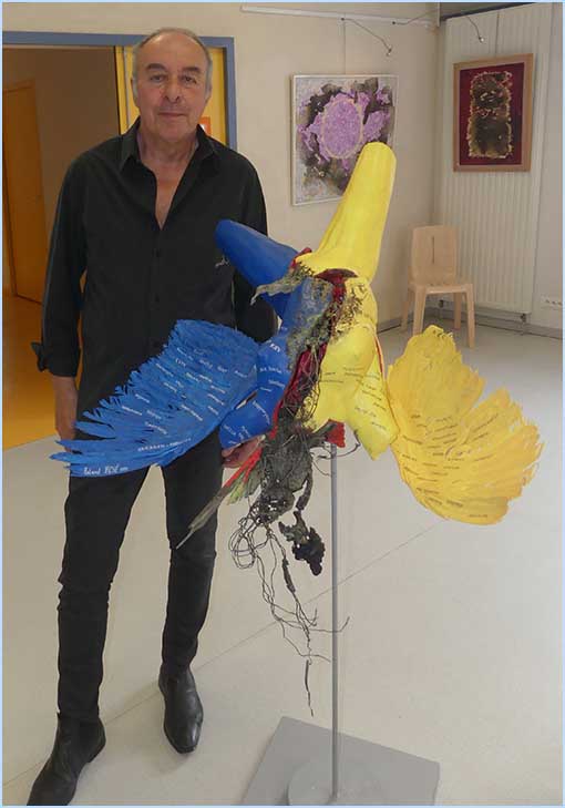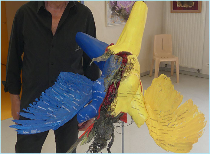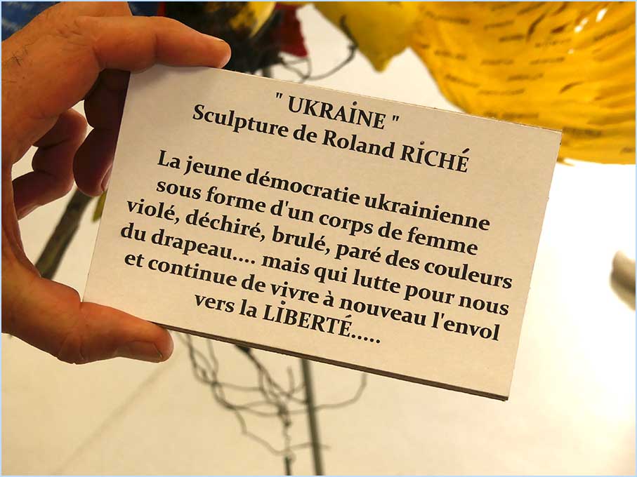 "Ukraine", soutien symbolique jaune et bleu, sculpté par