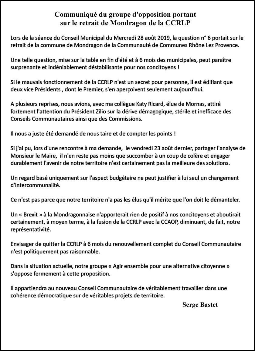 Un retrait de Mondragon de la Communauté de Communes Rhône-Lez-Provence ? L'opposition réfute fermement cette proposition