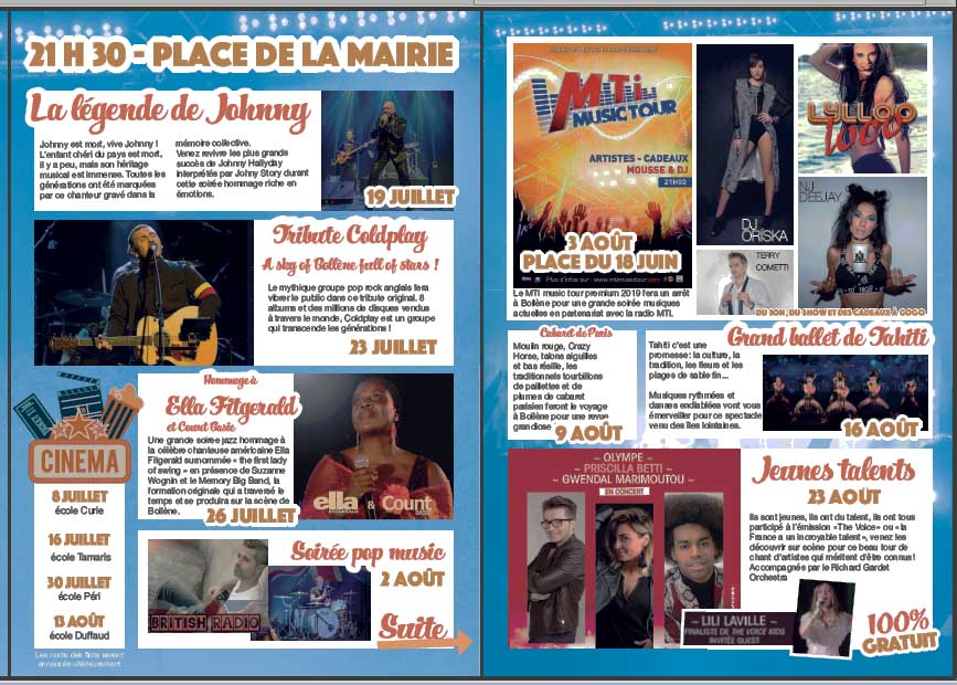Les autres ont encore le choix avec six prochains concerts dont un hommage à Ella Fitzgerald et Count Basie, vendredi 26 juillet à 21h30, place de la Mairie.                Programme complet :   - Affiche 1     - Affiche 2                                J. P.