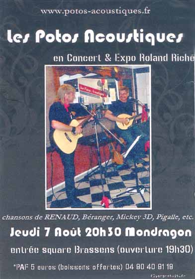 Après plusieurs autres expériences musicales, voici deux ans à Mondragon, ils ont créé un tandem : Les Potos Acoustiques. Leur boutade : « Alors que les Stone fêtaient leurs 50 ans de carrière, nous démarrions la nôtre à 50 ans. » Leur amitié s’est forgée du collège à la fac. Leur duo atypique totalise à ce jour une cinquantaine de concerts dans le Vaucluse et les départements limitrophes et les Pyrénées Orientales.