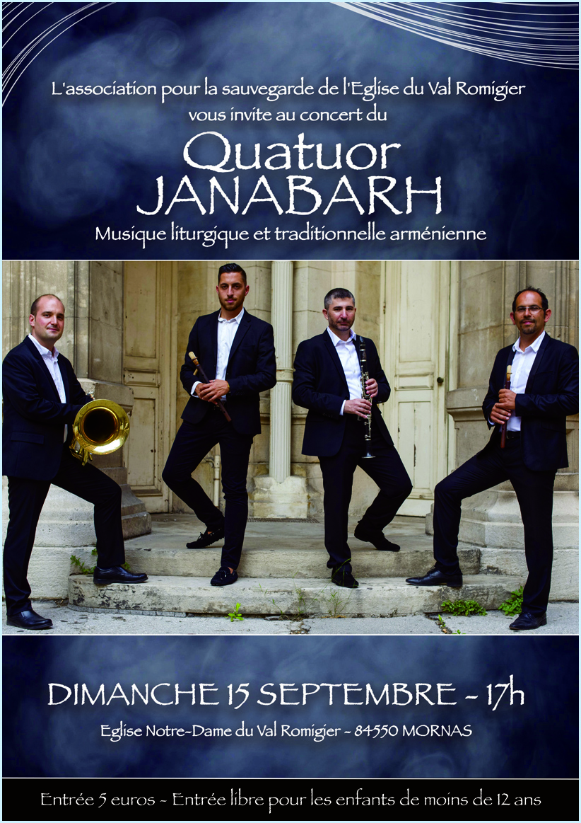 « Janabarh » (le chemin en arménien) est issu de la rencontre de quatre musiciens réunis et guidés par l’envie de développer et mettre en lumière les musiques arméniennes dans la voie ouverte par des maîtres comme le doudoukiste Djivan Gasparyan. Le quatuor à vents mêle des sonorités millénaires d’instruments traditionnels tels que le doudouk ou le beloul et d’instruments classiques avec la clarinette et l’euphonium. Il propose une lecture méditative des musiques liturgiques traditionnelles ou classiques arméniennes, anciennes ou plus modernes. Il interprète aussi une suite de Noëls provençaux. L’auditeur est donc invité au voyage dans le temps entre Orient et Occident.