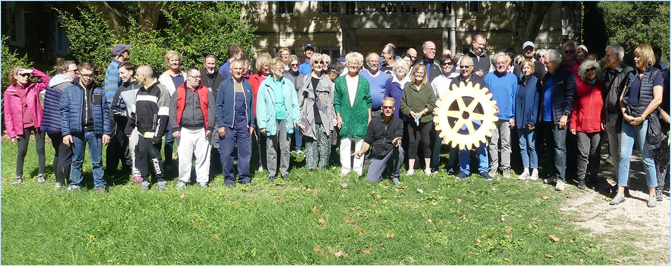 Munis de sécateurs, dans les vignes, étaient présents Laurence Chaix, présidente de l'ADAPEI, les pensionnaires et leur famille, 15 amis allemands du Rotary-Club d'Hassfurt (avec leurs délicieux pains spéciaux et saucisses bavaroises), des rotariens du Tricastin et de l'Ardèche (Bourg-Saint-Andéol, Vivier, Le Teil, Privas), des jeunes membres du Rotaract de Montélimar, les fidèles membres de la Légion d'honneur du comité de la Drôme Provençale... Soit une centaine de participants (photo) qui, vers midi, ont partagé un repas champêtre sous les platanes du château. Une cuvée spéciale sera mise en vente lors d'une soirée festive samedi 26 novembre à partir de 18h30 à la salle des fêtes de Pierrelatte. J. P.