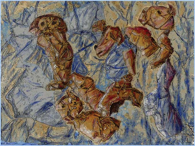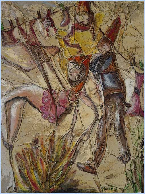 Maïté Domingo, autre retraitée rayonnante, est établie à Bourg-Saint-Andéol où elle exerçait avec passion le métier de coiffeuse. Avec la même ardeur, elle trouve aujourd’hui dans la peinture une même sensibilité. Mais avec une totale liberté : pas de modèles, ni de style défini, ni de maîtres, ni même d’outils. Un besoin tactile, qu’elle goûtait déjà en coiffant sa clientèle, l’oblige à peindre directement avec les doigts, en mélangeant les pigments avec du sable ou du papier froissé. D’où cette ineffable mythologie alignant des divinités hybrides, dignes d’un Chagall visitant Luna Park. « Je ne sais jamais où cela m’amènera, c’est le ressenti du moment ! »