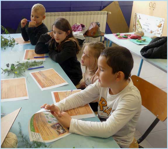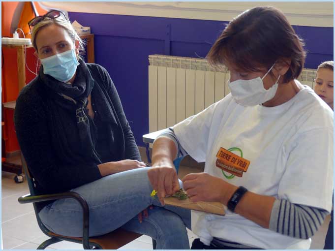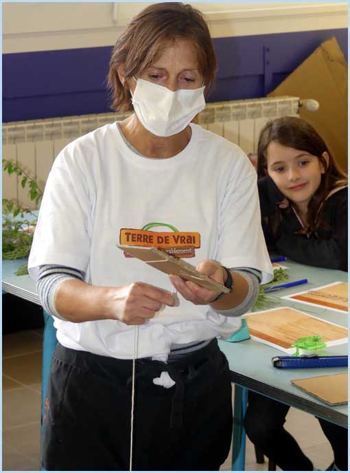 ![]() ![]() ![]() Corinne (au centre) dirige la fabrication d'un herbier. |