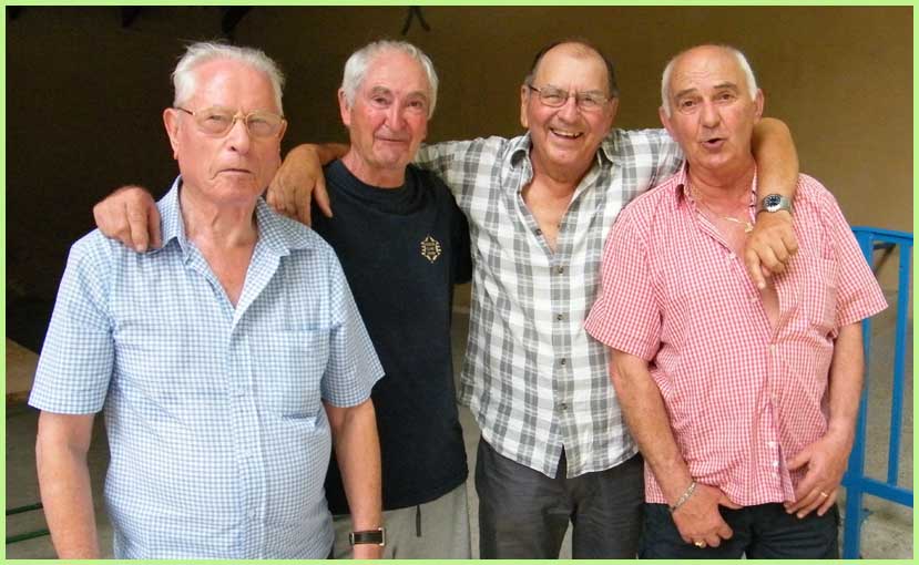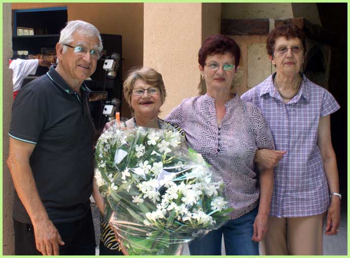 Un bel anniversaire pour Monique Joly, couverte de fleurs.              Les joueurs de pétanque (les deux gagnants sont à gauche).