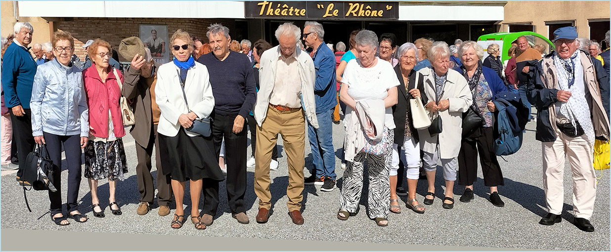 Un plaisir double combinant sortie touristique et spectacle a ravi une quarantaine de membres du foyer de l'âge d'or (photo). Ils sont allés à Bourg-lès-Valence et ont surtout fait halte au théâtre "Le Rhône" pour y apprécier un divertissement d'excellente qualité. Tant pis pour les absents qui l'ont manqué et ont toujours tort. Prochains rendez-vous : pique-niques à l'Ile-Vieille (1er juin, 13 juillet, 10 août, 7 septembre), belote (19 octobre), sorties (22 juin Romans et musée de la chaussure, 21 septembre Sète et spectacle cabaret), repas à la salle des fêtes (5 octobre, 2 novembre après l'assemblée générale, 7 décembre pour Noël). Contact : 04.90.51.88.32. J. P
