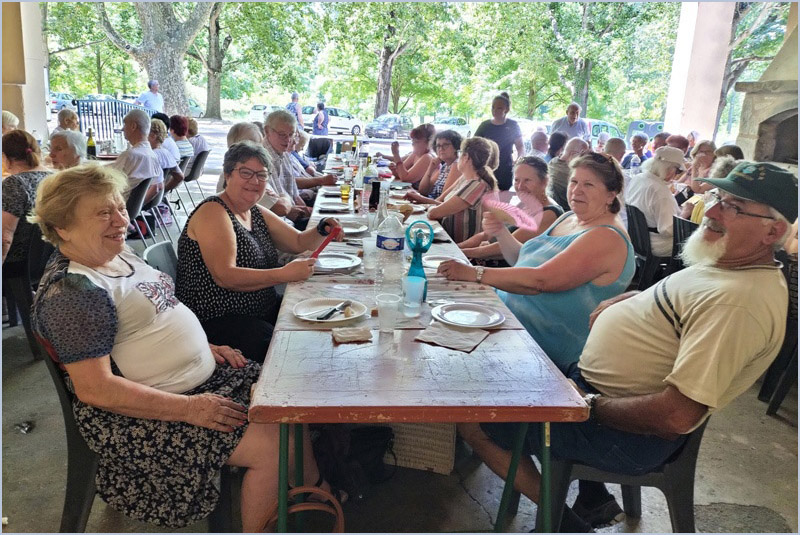 Durant les beaux jours, en juin, juillet, août et septembre, quatre repas champêtres réunissent l'âge d'or mondragonnais dans le cadre verdoyant de la ferme de l'Ile-Vieille. Celui-ci est le second de la série. Malgré la chaleur étouffante, 85 convives sont venus se régaler d'un bon aïoli, préparé par le traiteur Latour. Les plus courageux ont ensuite entamé une partie de pétanque, tandis que d'autres ont préféré la belote, moins fatigante. Prochain rendez-vous convivial et gourmand Jeudi 8 aoüt autour d'un excellent poulet basquaise. Contact : 04.90.51.88.32. J. P.