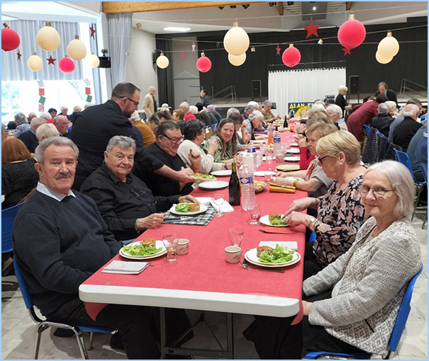 Sur les 150 inscrits au repas de Noël du Foyer de l'âge d'or, 139 convives se sont régalés d'un bon menu, préparé par l'Atelier des Gourmets, d'un coût limité à 20 € à l'occasion des 50 ans de l'association. Empêchés ou souffrants, les 11 absents ont manqué un formidable banquet dansant, animé par le fidèle Alan Flor toujours plébiscité par tous.