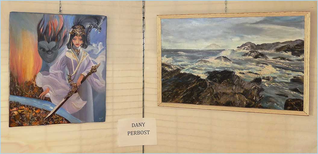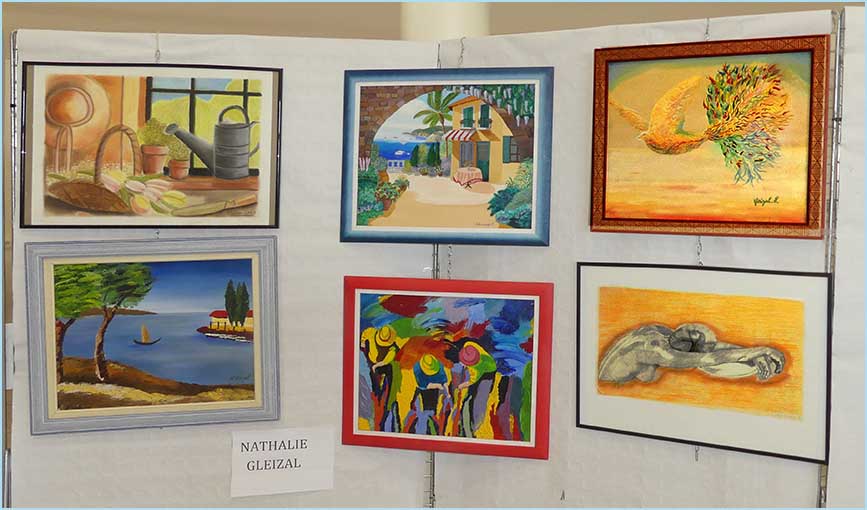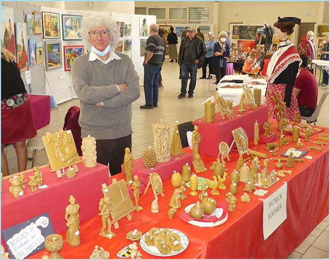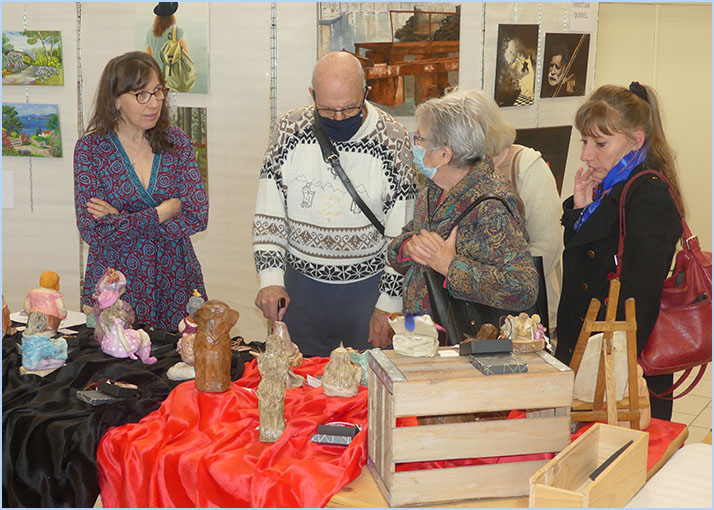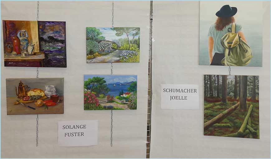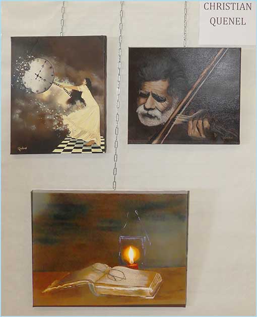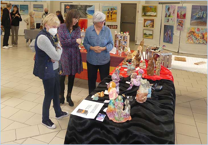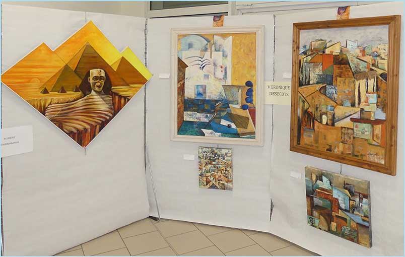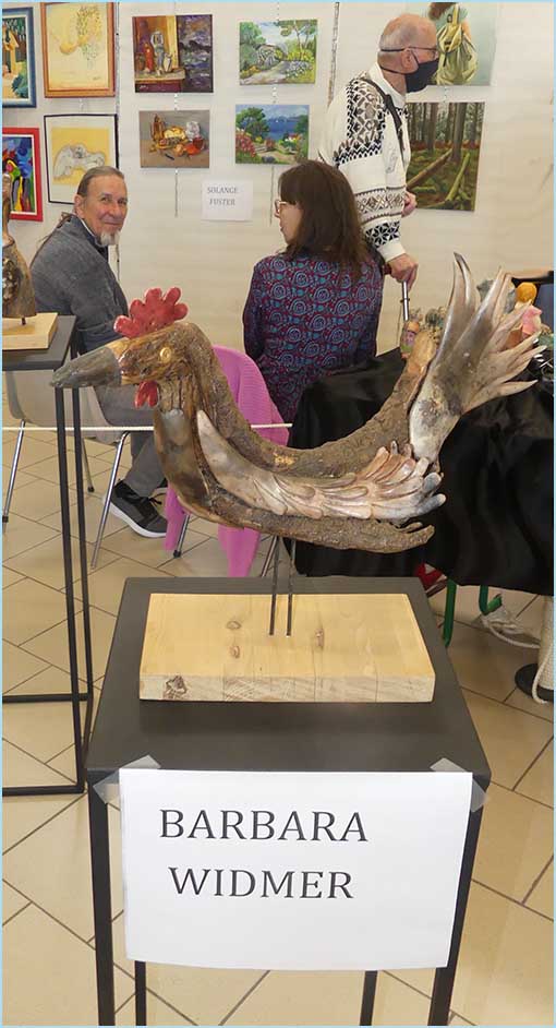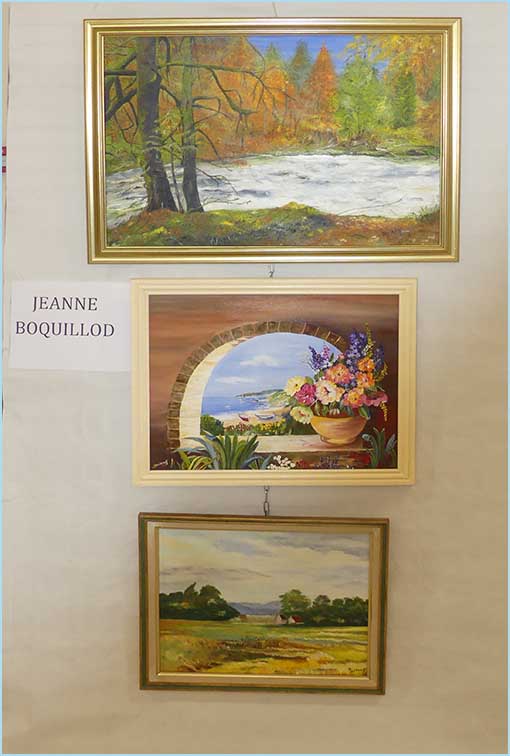 L'exposition ne dure que le temps d'un week-end. C'est court pour tant de travaux artistiques diversifiés : peinture, sculpture, photographie, travaux d'aiguille, artisanat d'art, etc. J'ai renoncé à légender toutes mes photos... C'est un véritable parcours du combattant, en quête du nom juste correspondant à l'oeuvre. Tout est bien écrit (bravo à l'organisation), mais je mélange mes pinceaux ! A ce propos, j'ai peint et exposé, moi aussi, dans ma prime jeunesse. Comme la plupart de ceux qui exposent ici, je n'étais qu'un peintre du dimanche, un amateur qui a largué sa palette. Je continue sans doute à travers ceux qui sauvegardent leur hobby pictural. D'où ces pages multiples, sur ce site web, qui leur sont consacrées. J. P.