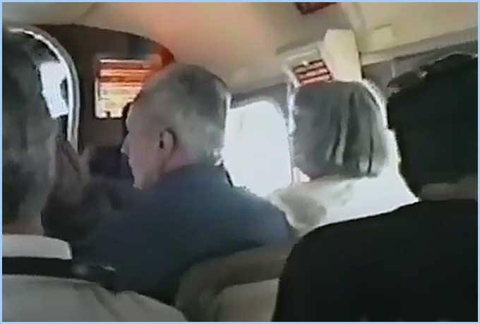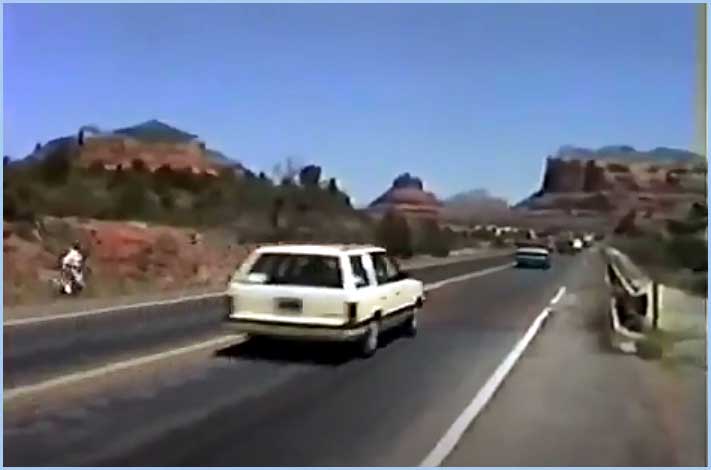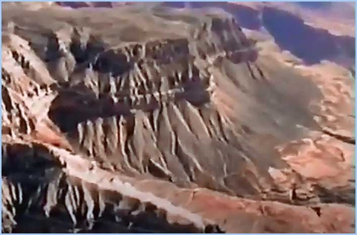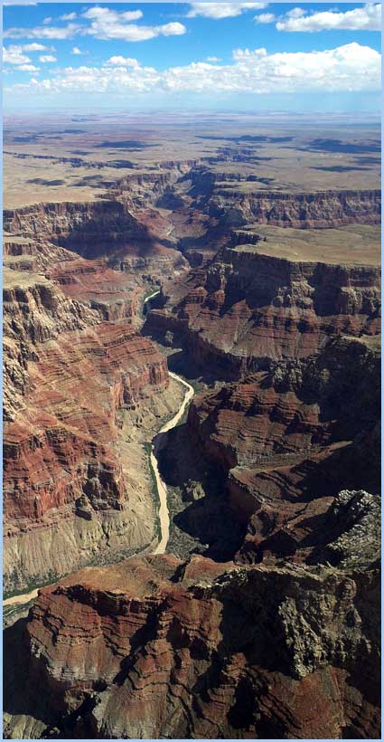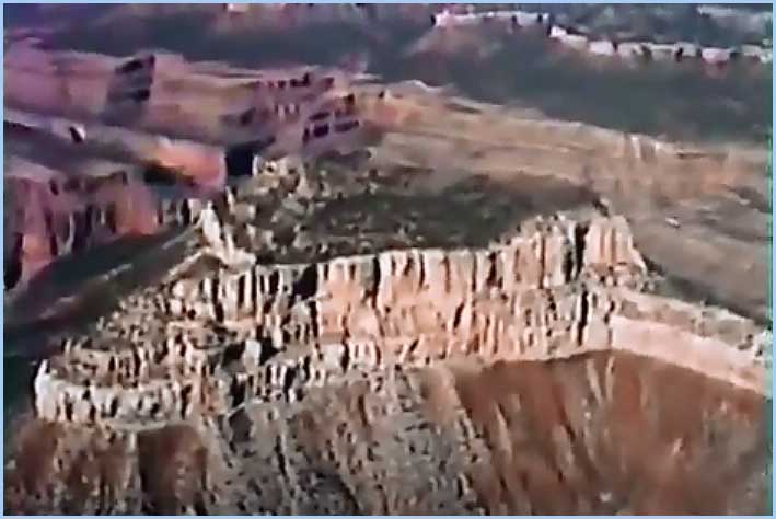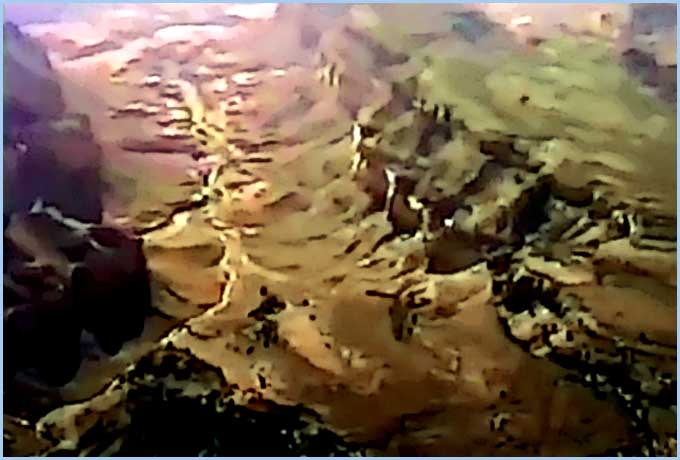 Inversement proportionnelles à celles de la zone survolée (grosso-modo 400 Km de long jusqu'à 30 Km de large), les dimensions du coucou touristique, qui hoquetait au-dessus des gorges profondes creusées par le fleuve Colorado, avaient l'air d'être celles d'un gros moustique fatigué. Secoués comme les prunes tombant de l'arbre, les passagers étaient dotés d'une sorte de gibecière, pendue par le cou et calée sur les genoux, afin d'y restituer éventuellement le dernier repas pris au restaurant. Partagés aux codétenus de cette galère volante, les sacs destinés aux vomissements prévisibles se sont largement remplis. Faisant partie du lot des sinistrés du ciel, j'ai quand même filmé quelque chose d'approximatif à travers mon hublot, sans trop me soucier du cadrage, peut-être rectifiable lors du montage de la séquence vidéo... Ô miracle ! Les images étaient récupérables. S'il faut parfois souffrir pour être beau, il peut aussi le falloir pour ingérer une vision d'exception dans des conditions difficiles. A charge d'en restituer plus tard l'exacte splendeur.