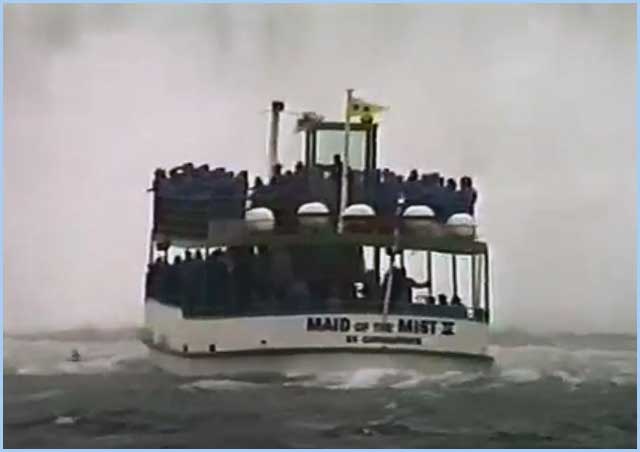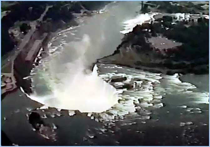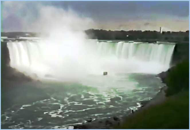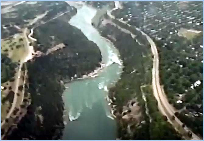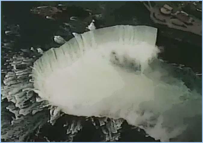 Le défi pour les quelques passagers d'un assez gros hélico survolant une zone d'exception, c'est d'accaparer un hublot. Pour correctement filmer quelque chose, pas question de mégoter par-dessus une épaule gênante. Un minimum de civilité aidant, combien de fois ai-je dû refréner l'envie de tordre le cou d'un touriste obstruant le champ de la prise de vues ! On zoome alors entre deux tronches importunes en rasant la tignasse et les esgourdes à contre-pour, pour hypothétiquement atteindre l'arrière-plan convoité. Mais rien de tout cela ici. Vu du ciel en forme de grandiose fer à cheval (presque 1 kilomètre de développé sur 57 mètres de haut), l'arc de la cascade des eaux tumultueuses de la rivière Niagara m'est apparu sans le moindre écueil. Un privilège insensé résultait des rotations de l'hélico, qui pivotaient sans écart selon une orbite spéciale dont j'étais le centre absolu. Béni soit ce pilote qui m'a permis de glaner l'une des plus belles images du monde ! J. P.