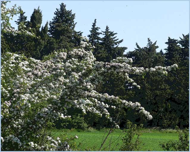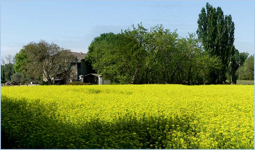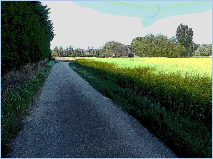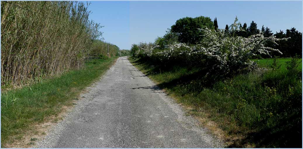 D'où ce détour : je tourne à droite et ne traverse donc pas laNationale 7 pour ensuite enprunter la première voie vicinale, à droite, qui mène vers la plaine. Les champs de colzas y sont en fleur, et les chemins, bordés d'arbustes fleuris... Ça, j'aime !