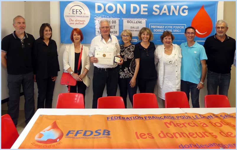 Lancée en 2004 par l’Organisme mondial de la santé (OMS), la journée mondiale du Don du sang a pour but, chaque mi-juin, de caresser la fibre altruiste des populations, face aux enjeux permanents de l’Etablissement français du sang (EFS). Toujours très active, l’amicale des donneurs de sang bénévoles (ADSB) de Bollène a profité de ce jour anniversaire pour mettre à l’honneur un de ses membres, André Vigili, pour son dévouement depuis une bonne vingtaine d’années. Lors d’une cordiale réception, le président Daniel Vasquez lui a remis une médaille et un diplôme, témoignant de son indéfectible disponibilité, et lui a dit en substance : "Grâce à ton engagement, nous atteignons notre objectif et reppelons que donner son sang est un geste simple qui ne coûte rien mais sauve des vies."