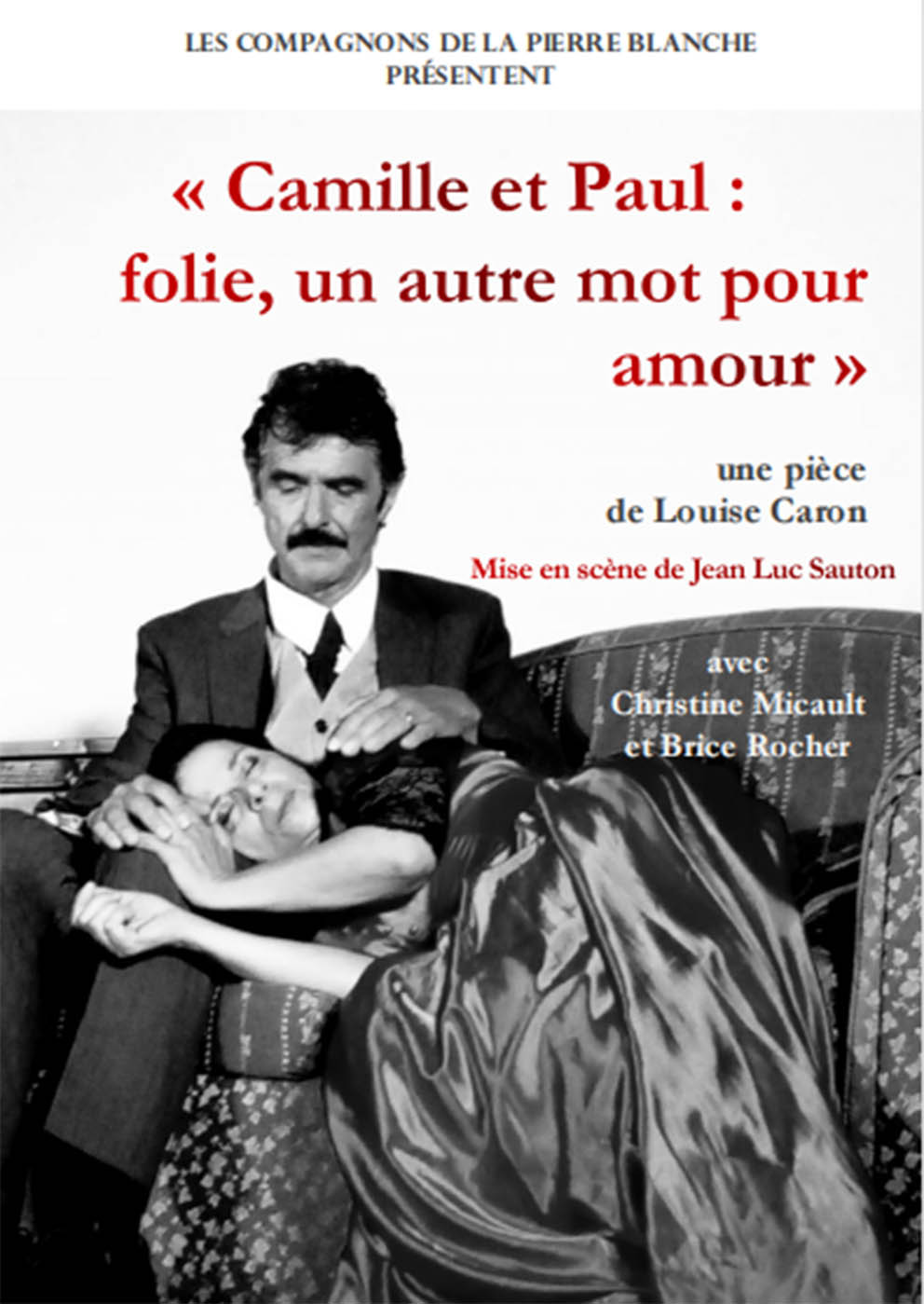 Pour celles et ceux qui auraient loupé l'immanquable, les Compagnons de la Pierre Blanche de Saint-Paul-trois-Châteaux viennent à Bollène pour y rejouer "Camille et Paul : folie, un autre mot pour amour", une pièce de Louise Caron, mise en scène par Jean-Luc Sauton, avec les comédiens Christine Micault et Brice Rocher. Cette représentation est organisée au profit de l'association des Donneurs de sang bénévole de Bollène. Rendez-vous le samedi 1er octobre à 20h30 salle Georges Brassens. Entrée 10 €. |