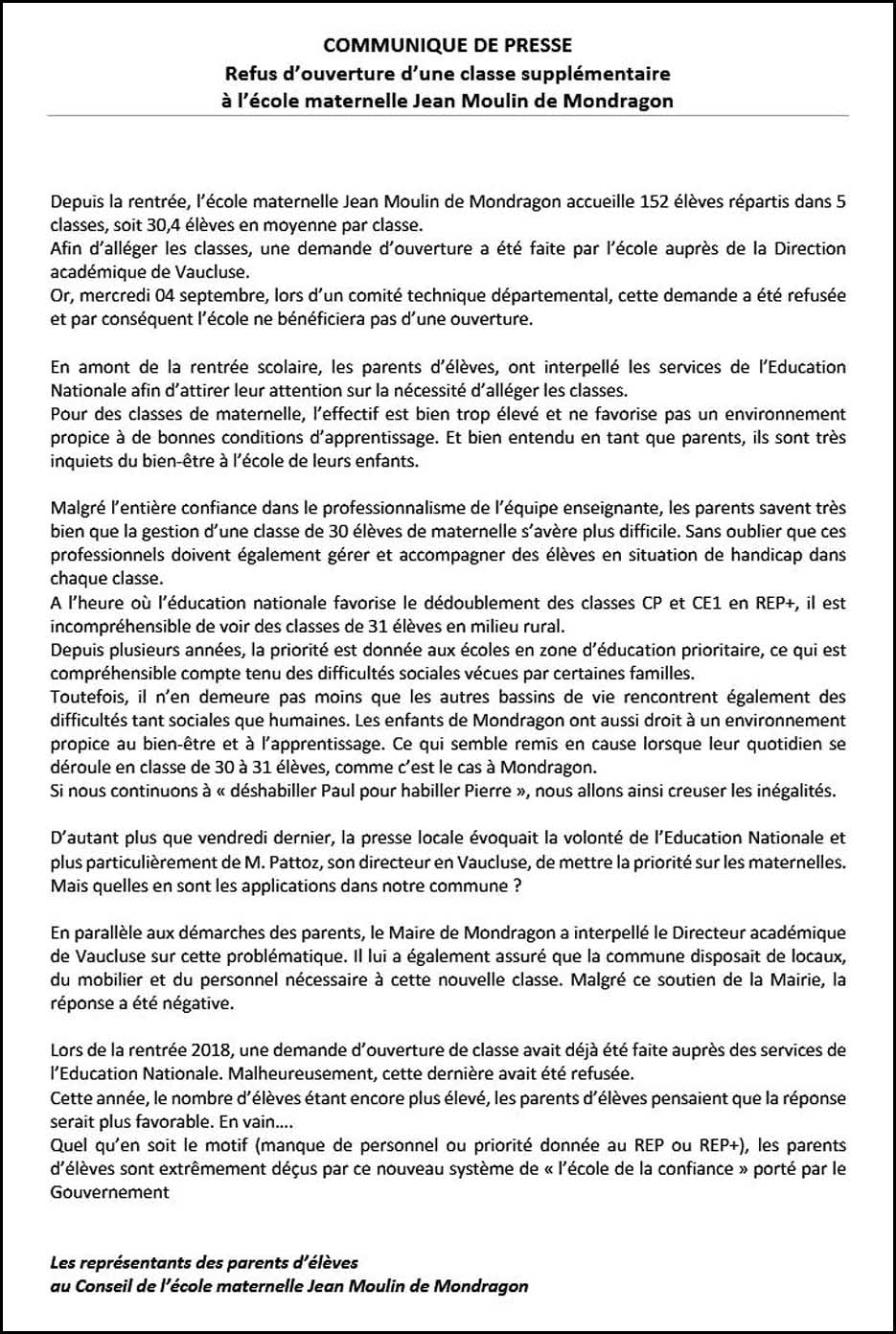 Ci-dessus : Communiqué des parents d'élèves (Cliquer dessus pour l'agrandir)