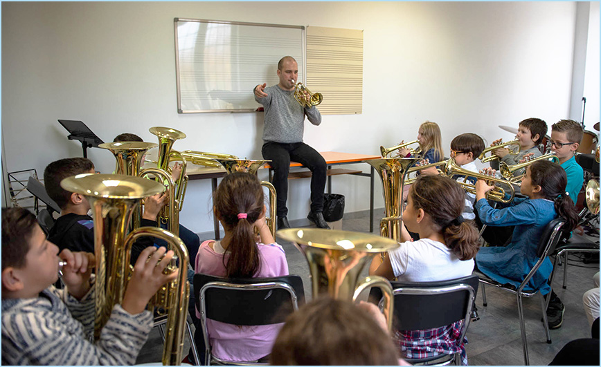 Ensemble de cuivres dirigé par Valentin Conte, professeur et coordinateur intercommunal.C'est la 5ème rentrée enthousiaste du Réseau intercommunal des enseignements artistiques pour Mondragon, Lapalud et Lamotte-du-Rhône. Depuis quelques semaines, les cours et activités hebdomadaires ont repris à l'Ecole de musique intercommunale. Les effectifs affichent près de 160 élèves inscrits et plus de 480 enfants qui vont participer au programme "Musique à l'école" à Lapalud et Mondragon. Ce dispositif éloquent totalise 15 disciplines individuelles et 12 disciplines collectives qui sont enseignées par 10 professeurs. Les deux premières auditions publiques des élèves sont programmées :