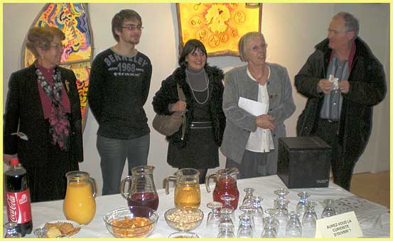 Les explications (un peu touffues) abondent lors du vernissage. Françoise Cuillerai, présidente de l'O. T. (veste grise), est fière de son hôte. |