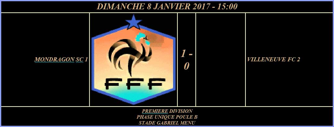 « Certains diront que l’équipe adverse était beaucoup moins forte, je réponds de suite que Mondragon pouvait surclasser beaucoup d’équipes ce dimanche et des plus fortes ! Match impeccable de tout le monde, on s’est régalé en tant que spectateur avec ce score fleuve de 7 à 2 ! Kamal et Julien qui ont arrêté de râler, pour se consacrer au foot, ont récolté les lauriers. Kamal avec un doublé dont une frappe formidable et Julien qui a réussi un quadruplé en rentrant en cours de jeu. Le tout conclu par une tête de Samir. Notons aussi 5 passes décisives de Rachid et les courses d’Artman derrière. Notre gardien a eu une journée tranquille malgré deux petites incursions de l’équipe adverse. L’équipe entière est à féliciter et espérons que nous ferons la même chose contre les « Franco Turc d’Avignon » tirage pour le 9 octobre à Avignon. »