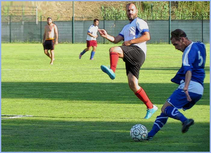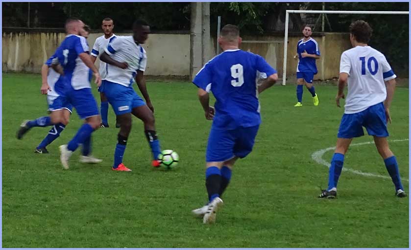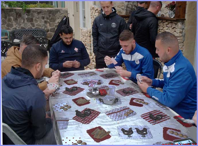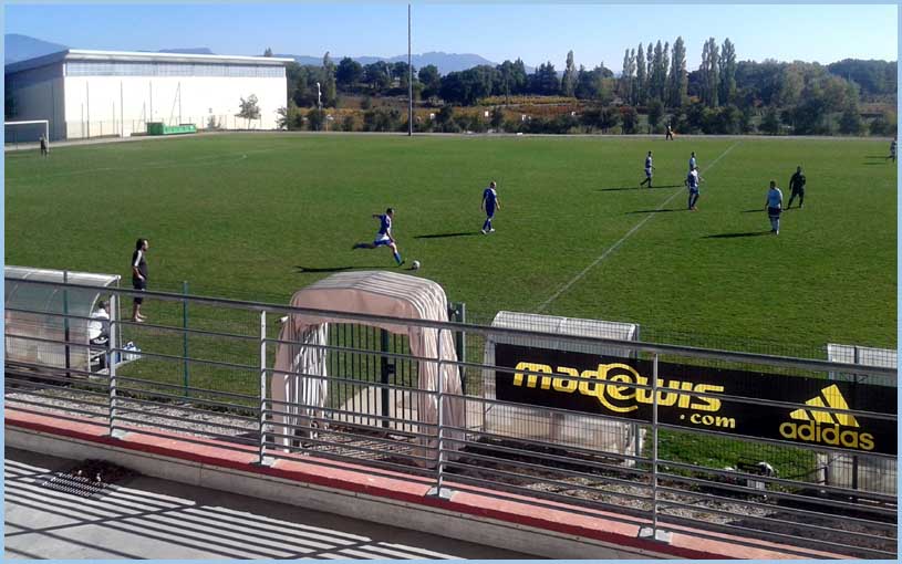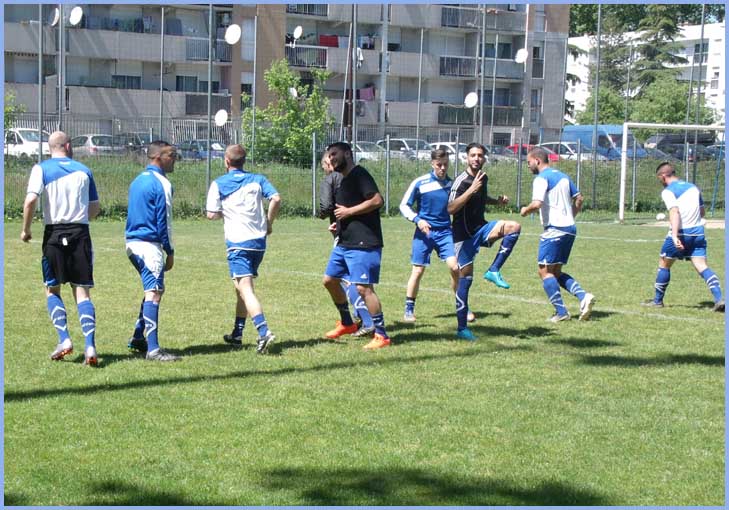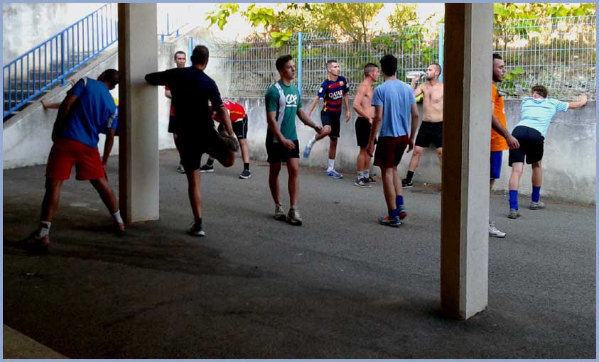 Après une première semaine d’efforts physiques, la suite se complique pour les joueurs. Le fameux entraînement, qui a pour cadre le dénivelé du groupe scolaire Jean-Moulin, a débuté. Le principe est simple mais efficace : il faut monter des escaliers, bien sûr, pas n’importe comment. Les jambes ont fait mal, ce jour-là ! Suivait un petit décrassage avec le ballon, en vue d’un match amical, prévu le lendemain. Ce n’était pas vraiment une partie de plaisir. Car de passage à Mondragon, l’équipe adverse lyonnaise évolue régulièrement en DHR. Les Mondragonnais ont au moins bénéficié d’une petite leçon de football, le but du jeu étant surtout d’apprendre. Malgré le score sans appel, aucun regret.