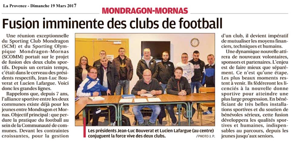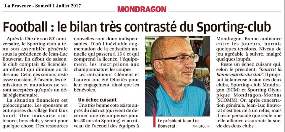 Reste un échec cuisant qui, selon le président, « pourrit la bonne marche du club. » Il projetait la fameuse fusion des deux clubs, Sporting-club Mondragon (SCM) et Sporting Olympique Mondragon-Mornas (SCOMM). Or, après concertation générale, Jean-Luc Bouverat s’est heurté à un refus haineux, mais il reste persuadé que seule une telle alliance assurerait la survie des deux clubs.          J. P.