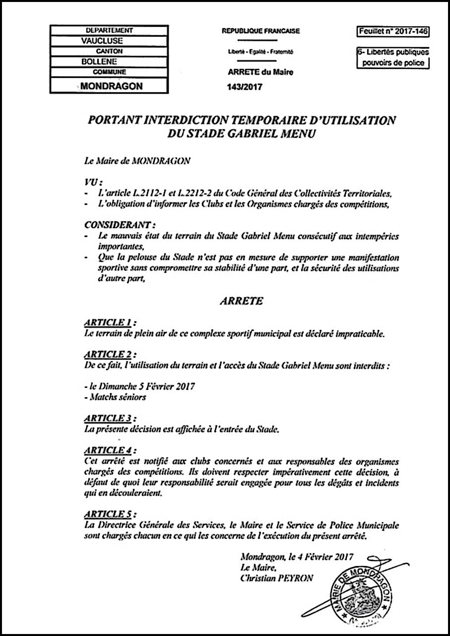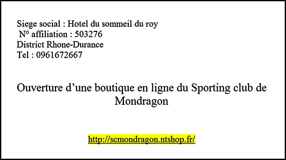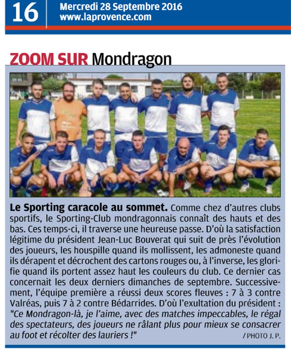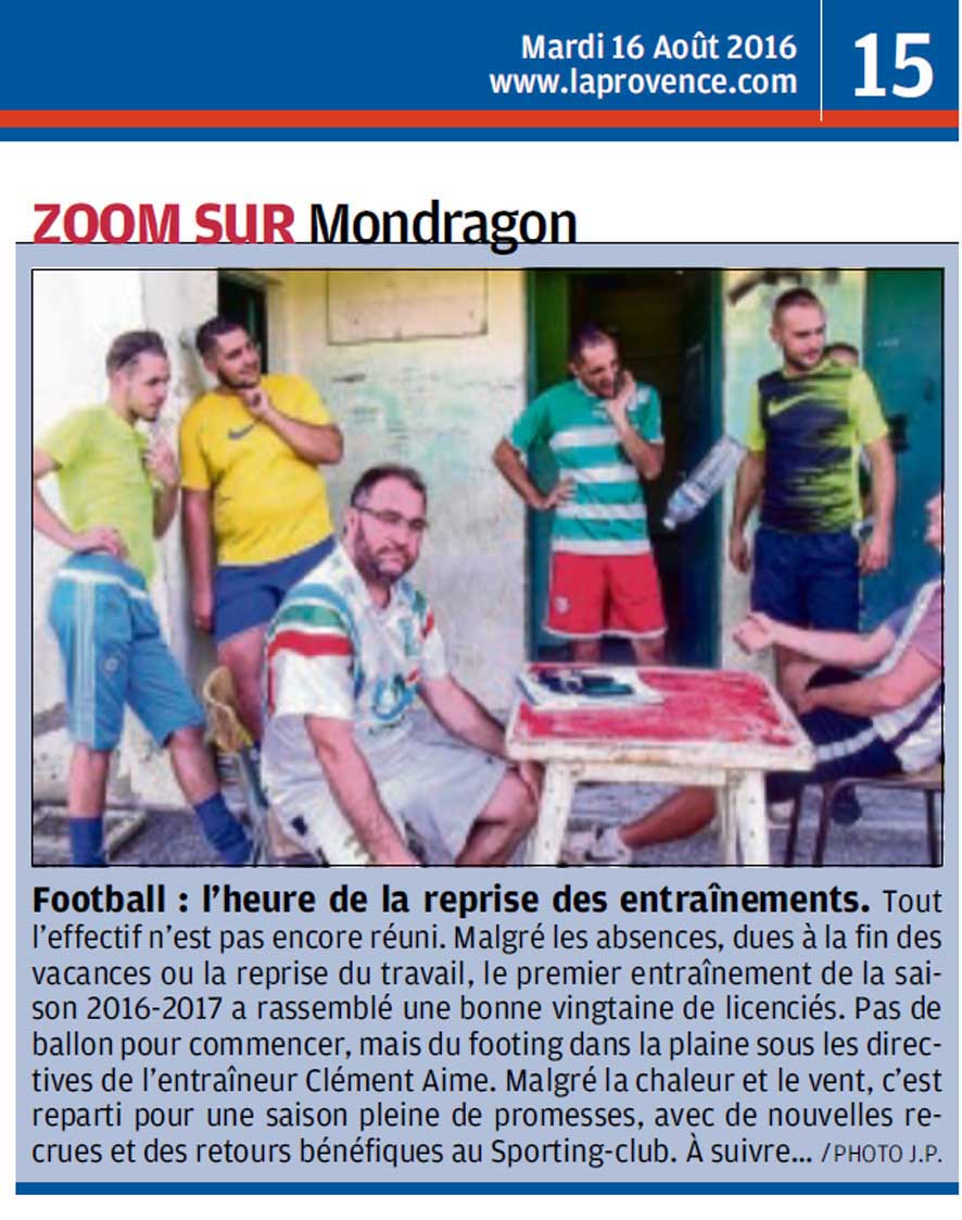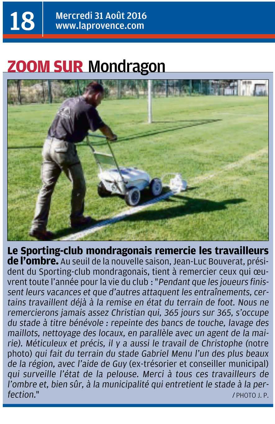 Au seuil de la nouvelle saison, Jean-Luc Bouverat, président du Sporting-club mondragonais, nous adresse ce communiqué : « Pendant que les joueurs finissent leurs vacances tranquillement et que d’autres attaquent les entraînements, certains travaillent déjà à la remise en état du terrain de foot. Nous ne remercierons jamais assez Christian qui, 365 jours sur 365, s’occupe du stade à titre bénévole : repeinte des bancs de touche, lavage des maillots, nettoyage des locaux (en parallèle avec un agent de la mairie). Si une personne est à respecter dans le club, c’est sûrement lui ! Méticuleux et précis, il y a aussi le travail de Chritophe qui fait du terrain du stade Gabriel Menu l’un des plus beaux de la région, avec l’aide de Guy (ex-trésorier et conseiller municipal) qui surveille l’état de la pelouse. Merci à tous ces travailleurs de l’ombre et, bien sûr, à la municipalité qui entretient le stade à la perfection. »