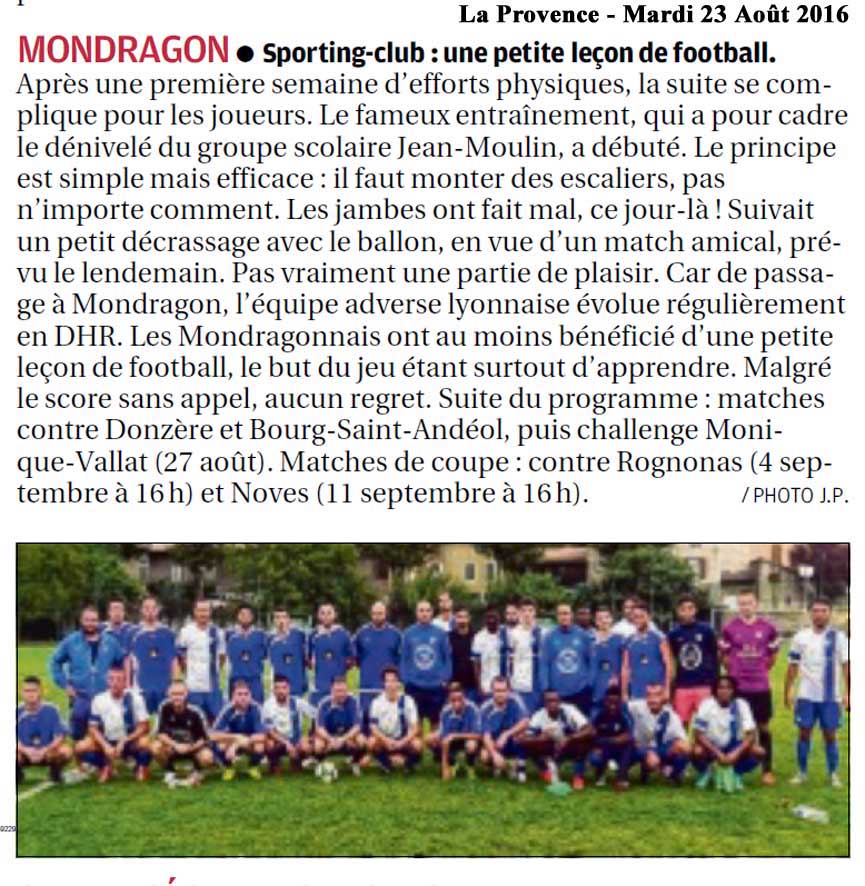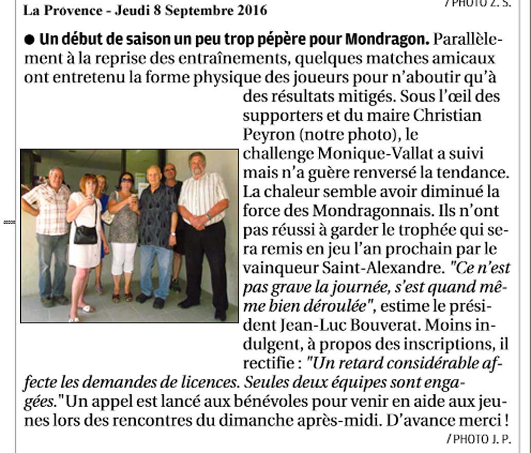 Toujours une semaine d’entraînement pour les joueurs avec des matches amicaux et du physique. Après des résultats mitigés sur les matches amicaux, le Sporting-club organisait le tournoi « Monique Vallat »  le 27 août. Est-ce la chaleur, le manque de communication ? On ne peut pas dire que les Mondragonnais se soient déplacés en force. Ce n’est pas grave, la journée s’est très bien déroulée et malheureusement Mondragon n’a pas réussi à garder le trophée qui sera remis en jeu par le vainqueur Saint-Alexandre à la rentrée prochaine.