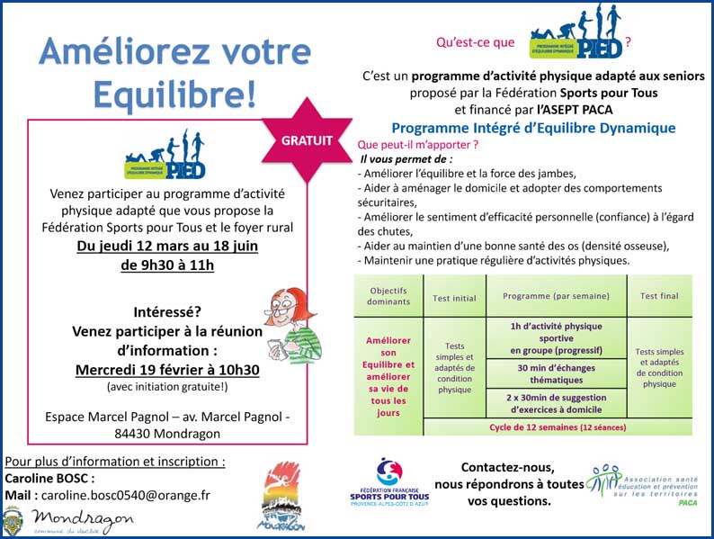 L’accueil intergénérationnel du Foyer des jeunes concerne aussi les aînés. D’où la mise en place du Programme intégré d’équilibre dynamique (PIED) adapté aux seniors, proposé par la Fédération Sports pour tous et financé par l’ASEPT PACA. Une récente réunion d’information a regoupé une douzaine d’adhérents auprès de l’animatrice Caroline Bosc. Son action porte sur la prévention des chutes pour les personnes âgées, selon une gymnastique spécifique par petits groupes, qui améliore l’équilibre et la force des jambes, aide à l’aménagement du domicile et aux comportements sécuritaires, conseille des activités physiques régulières, etc. Le tout s’étale sur 3 mois avec 12 séances hebdomadaires le jeudi de 9h30 à 11h du 12 mars au 18 juin, à la Maison Marcel Pagnol (avenue du même nom). Contact : caroline.bosc@orange.fr.