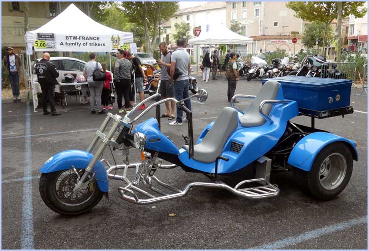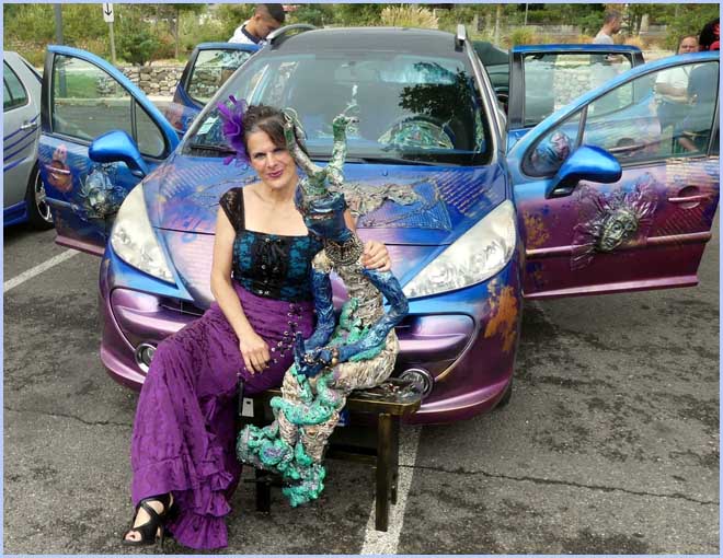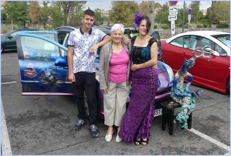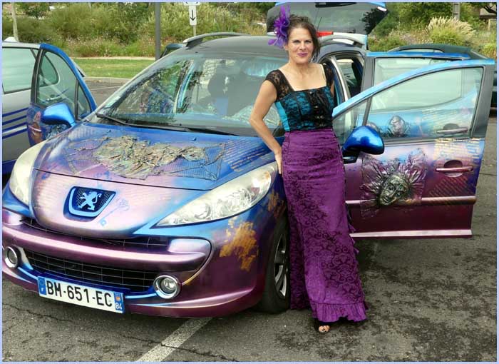 En cas d’évidente compatibilité, les quatre roues sont admises. C’est le cas de la Mondragonnaise Marisa Palmano (déjà présente en 2018), revenue avec sa Peugeot 209 complètement relookée : carrosserie bleu-nuit rehaussée de bas-reliefs mythologiques.
