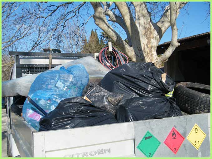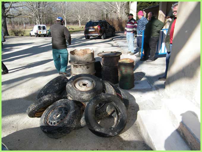 25 pneus de voiture, un fût de 200 litres, une cuisine complète, un matelas, une piscine, un chargement