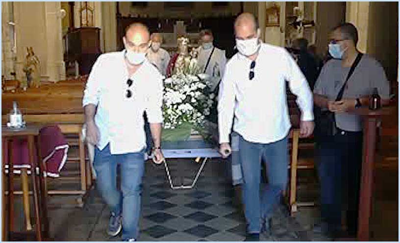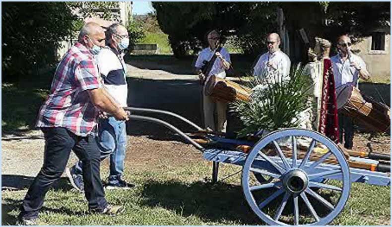 Marie est pieusement fleurie et véhiculée sur sa charrette.