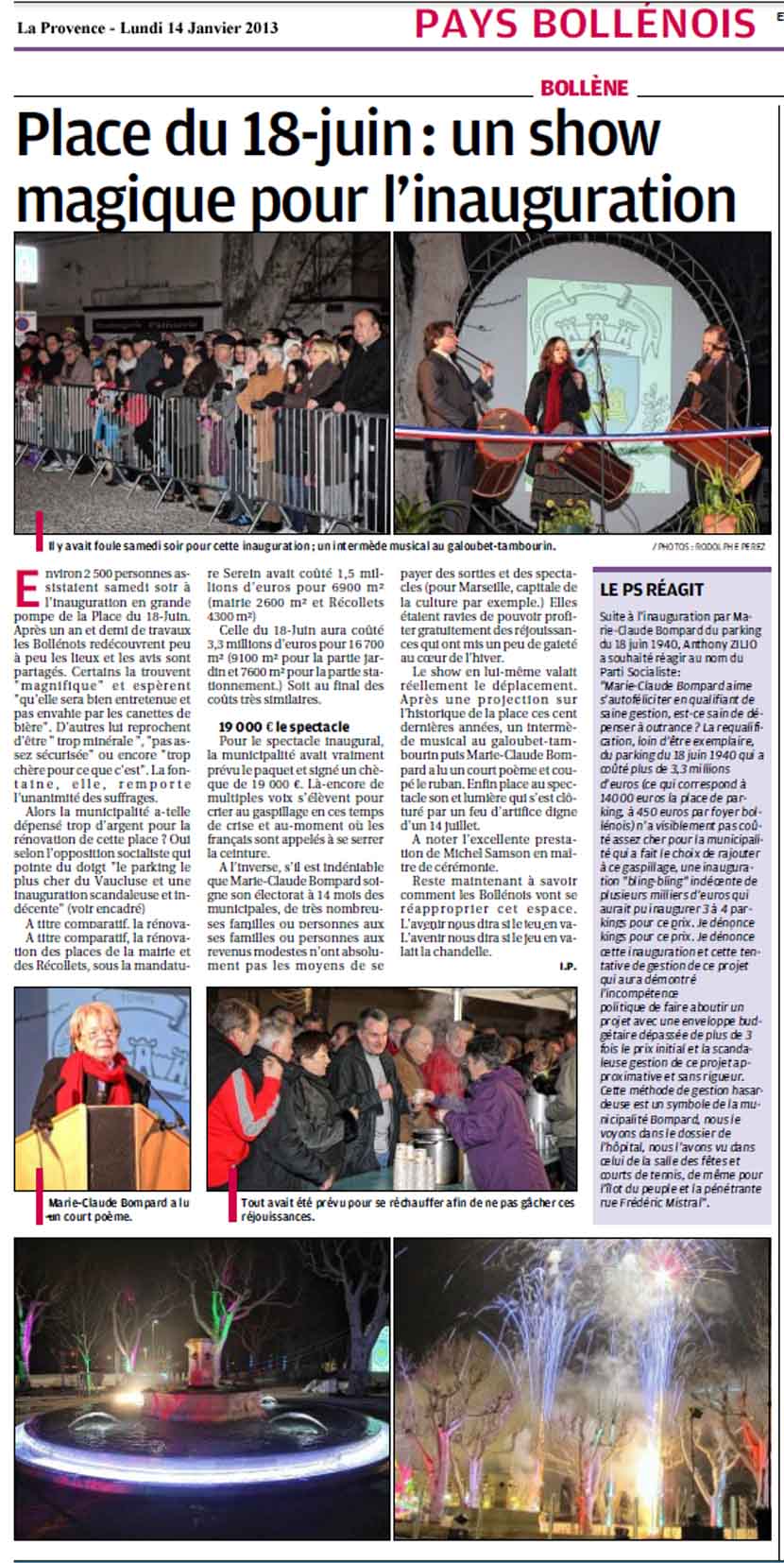 pour une belle place rendue aux Bollénois Une inauguration grandiose, historique, aquatique et pyrotechnique... Mais aussi décriée par les détracteurs, tandis que la foule applaudit... ![]() |